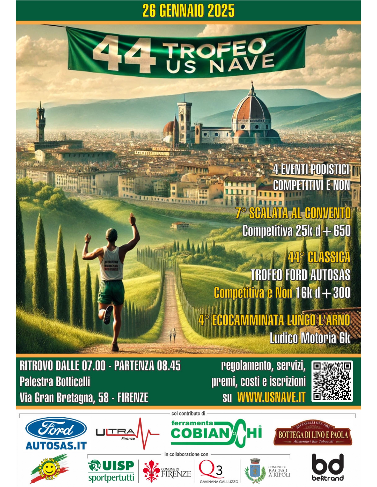 La US Nave ASD con la collaborazione del Quartiere 3, del Comune di Bagno a Ripoli (FI) e dell’Ente di Promozione Sportiva UISP organizza per domenica 26 Gennaio 2024 la 44^ edizione del TROFEO NAVE, manifestazione agonistica e non, rivolta ad appassionati di Corsa e Camminata su più distanze, tutte con partenza e arrivo presso la palestra Botticelli in Via Gran Bretagna 58, Firenze.