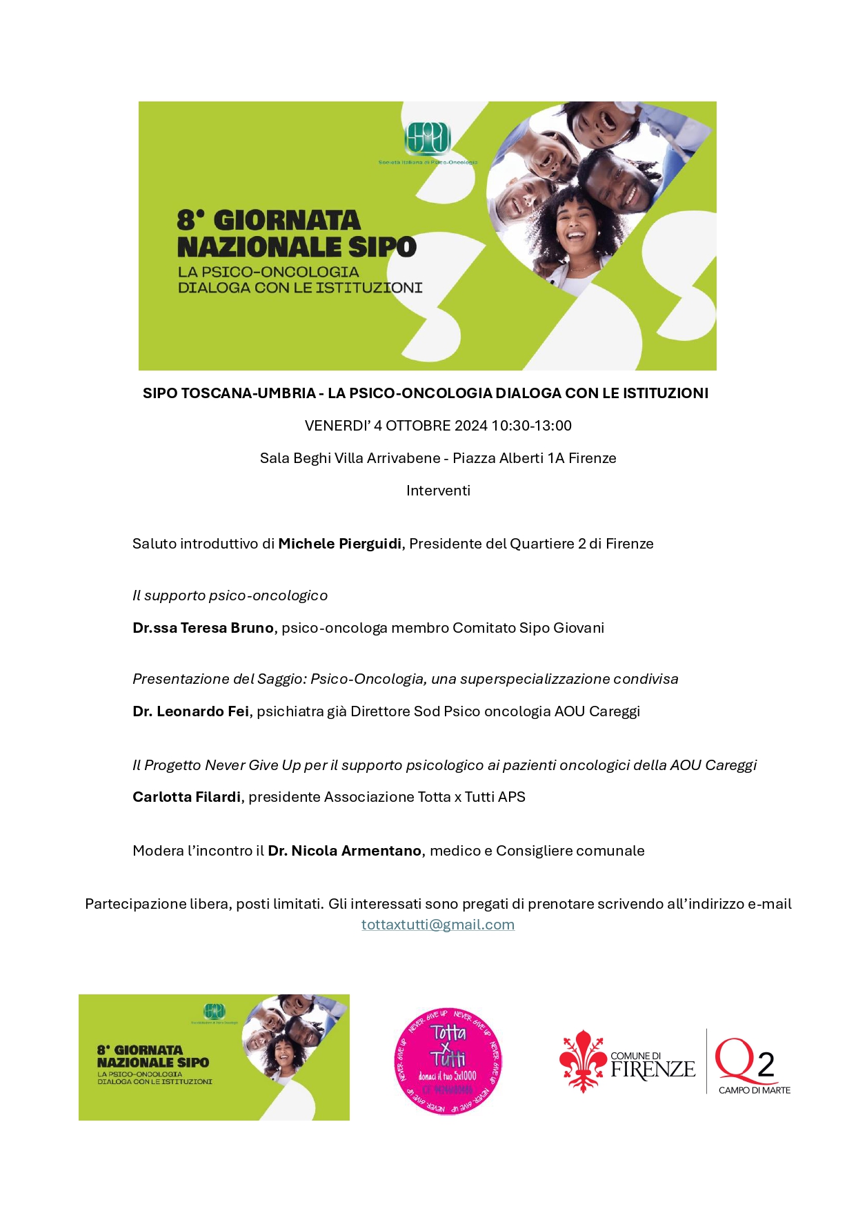 Interverranno all'incontro la Dott.ssa Teresa Bruno, psico-oncologa membro Comitato Sipo Giovani, il Dr. Leonardo Fei, psichiatra già Direttore Sod Psico oncologia AOU Careggi, Carlotta Filardi, presidente Associazione Totta x Tutti APS ed il Presidente del Quartiere 2 Michele Pierguidi, con la presenza del Dr. Nicola Armentano, medico e Consigliere comunale, in qualità di moderatore.