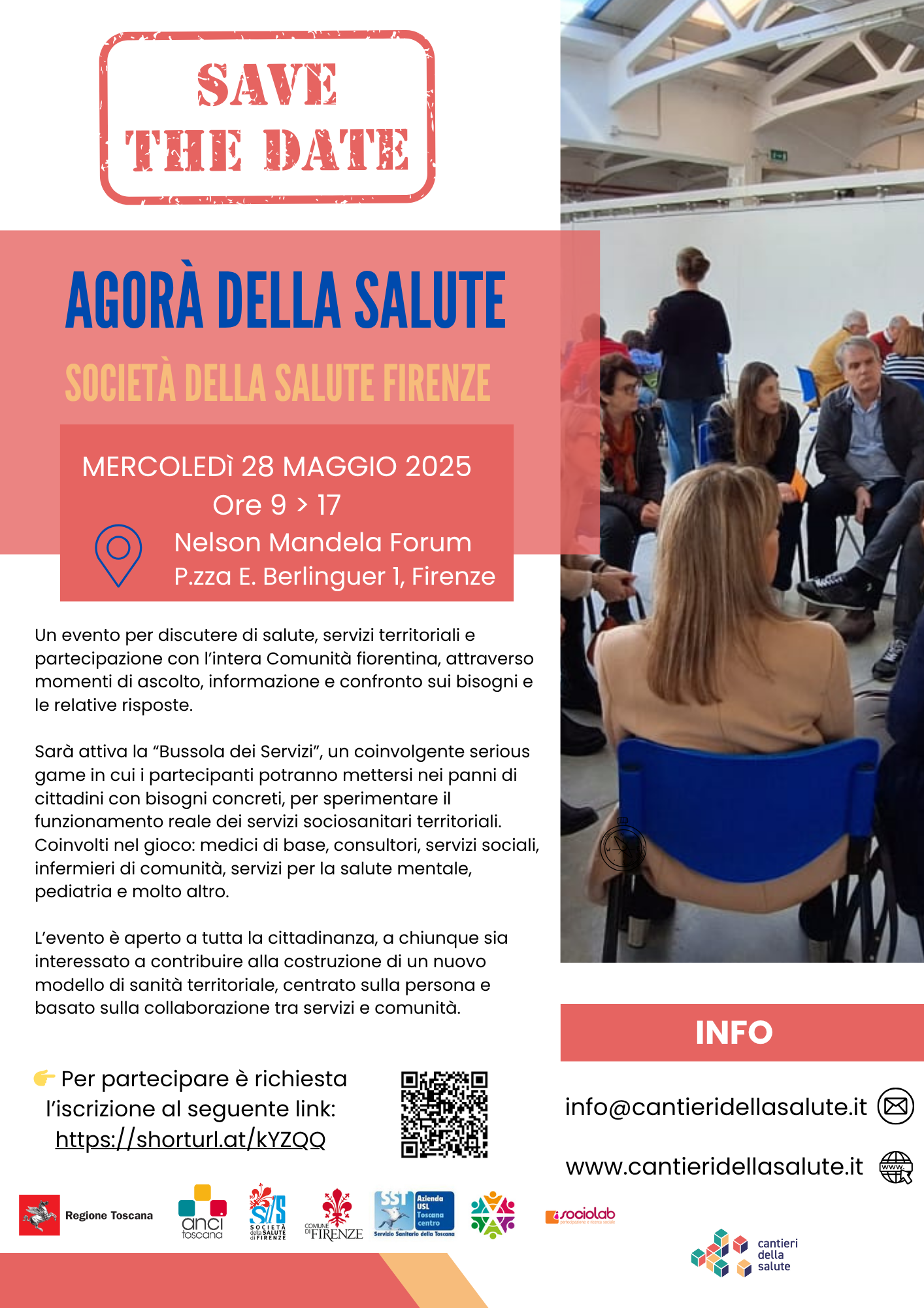 Al via le iscrizioni per l'evento che si svolgerà in data 28 maggio dalle ore 9.00 alle ore 17.00 presso il Nelson Mandela organizzato dalla Società della Salute di Firenze. L'iniziativa, promossa nell’ambito del progetto regionale "Cantieri della Salute", è coordinata da Federsanità Anci Toscana con il supporto di Sociolab Impresa Sociale, e vuole essere un’occasione di incontro tra Istituzioni, Terzo settore, cittadini e giovani, per discutere insieme della sanità territoriale del futuro. Durante la giornata, oltre a momenti informativi e laboratori partecipativi, sarà possibile prendere parte alla "Bussola dei Servizi", un serious game che permetterà ai partecipanti di sperimentare in prima persona il funzionamento dei Servizi territoriali attraverso il gioco di ruolo.