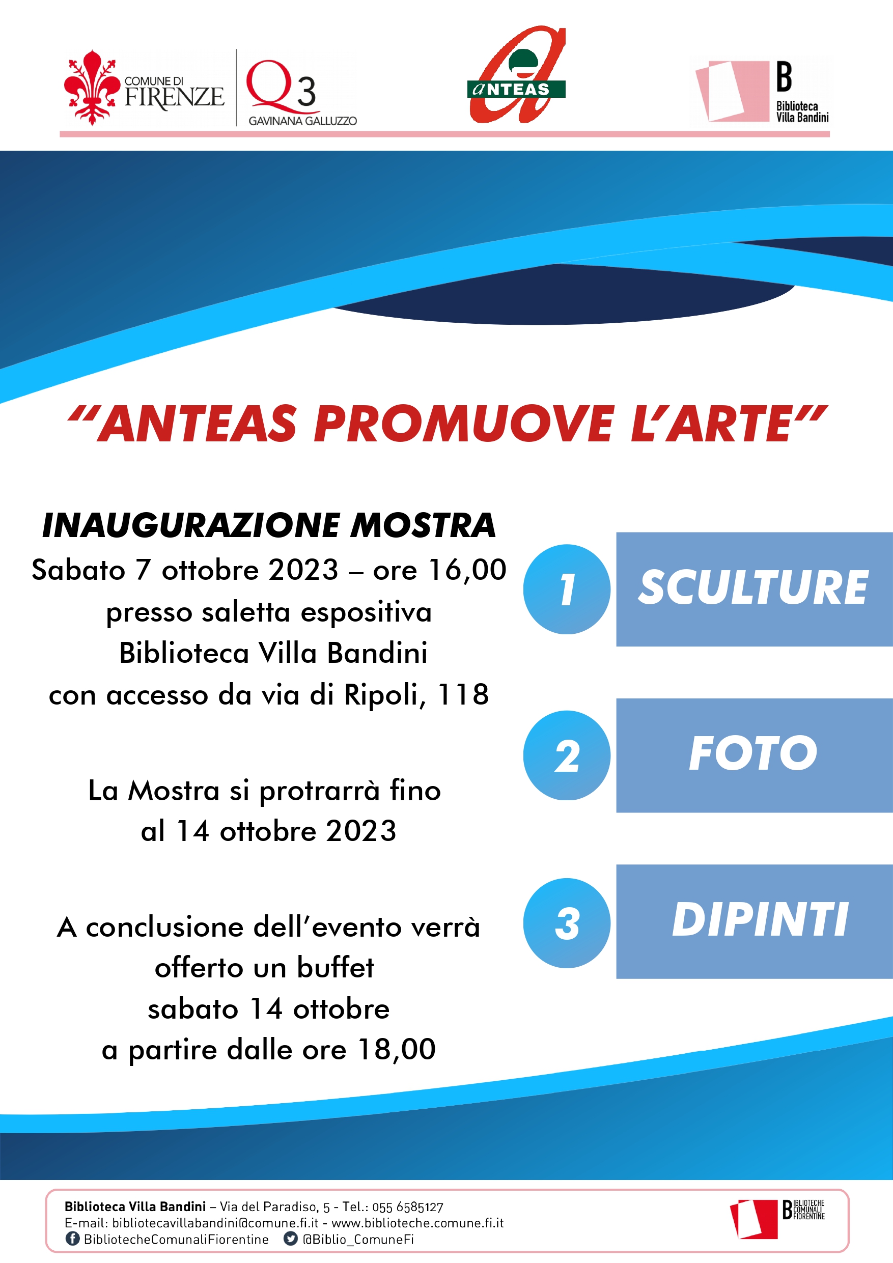 Da sabato 7 ottobre a sabato 14 ottobre 2023 Anteas organizza una mostra di dipinti, sculture e fotografie presso la biblioteca Villa Bandini, nella saletta espositiva con accesso da via di Ripoli, 118.