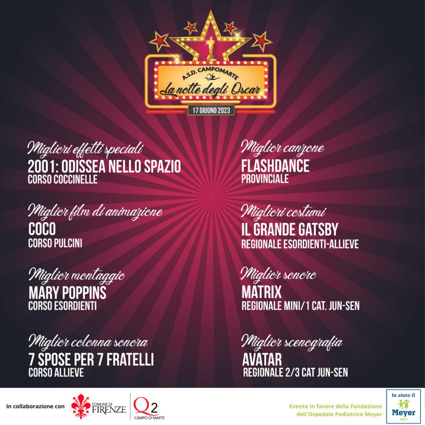 Sabato 17 Giugno alle ore 18.00, al Palazzetto San Marcellino in Via Chiantigiana 28, si terrà il saggio "La notte degli Oscar"; un evento benefico con i ragazzi dell'A.S.D. Campomarte e la collaborazione del Quartiere 2 il cui ricavato andrà in beneficenza alla Fondazione dell'Ospedale Pediatrico Meyer.