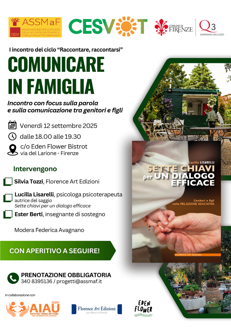 Venerdì 12 settembre 2025 dalle ore 18.00 alle ore 19.30 si terrà, presso Eden Flower Bistrot (via del Larione, 50126 Firenze), un incontro dal titolo "Comunicare in famiglia - Incontro e laboratorio con focus sulla parola (scritta e orale)".