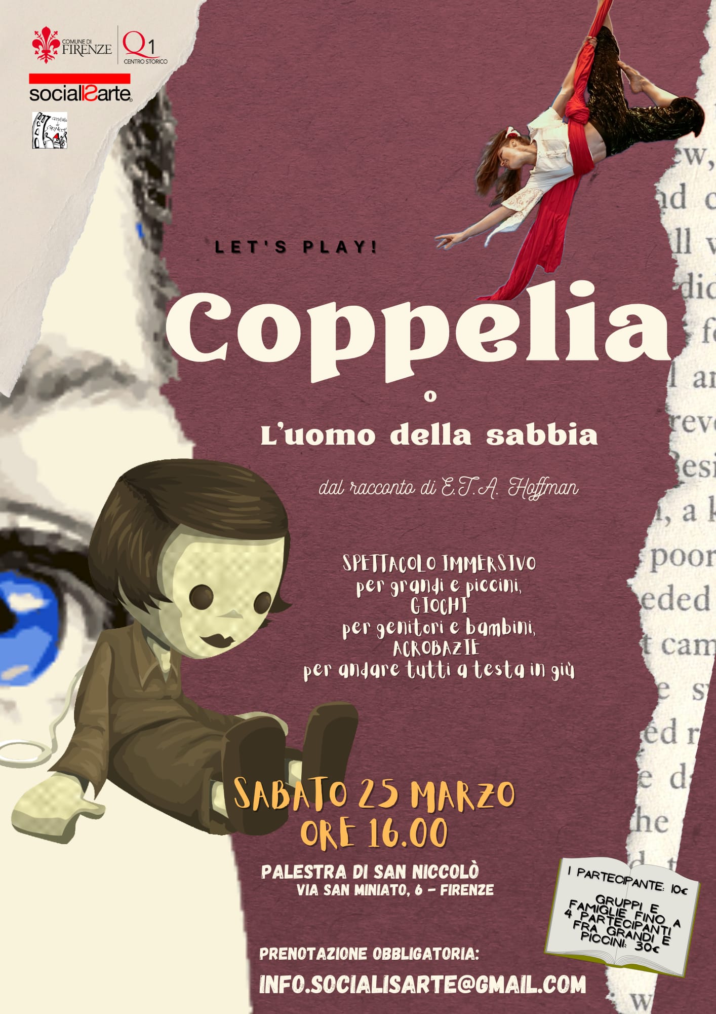 Per giocare insieme grandi e piccini, genitori e bambini, nonni e nipotini.E tutti insieme guardare lo spettacolo di danza e danza aerea con le allieve e i maestri di Socialisarte...e provare tutti ad andare a testa in giù!