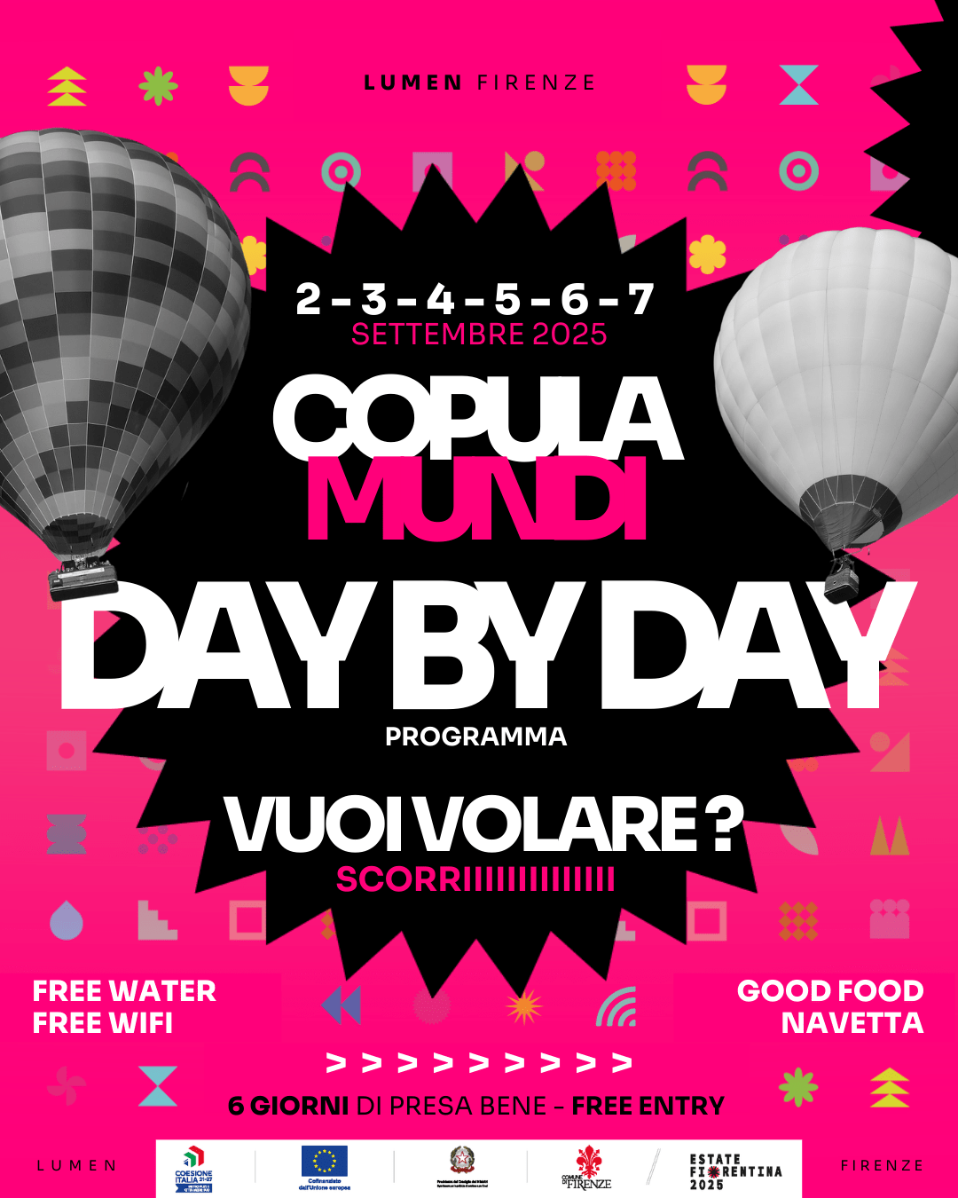 Torna anche nel 2025 Copula Mundi, il festival di di sperimentazione che stimola la creazione di nuovi immaginari artistici, culturali e laboratoriali realizzato con il contributo del Comune di Firenze, Publiacqua e Fondazione Cassa di Risparmio ed il supporto di AT-Autolinee Toscane; sei giorni di festival, tutti a ingresso gratuito, nei quali si alterneranno performance, laboratori, attività per i più piccoli, attività sportive, spettacoli teatrali e concerti, ospitati nel polo socio-culturale de Lumen, Laboratorio Urbano Mensola, in Via del Guarlone 25.