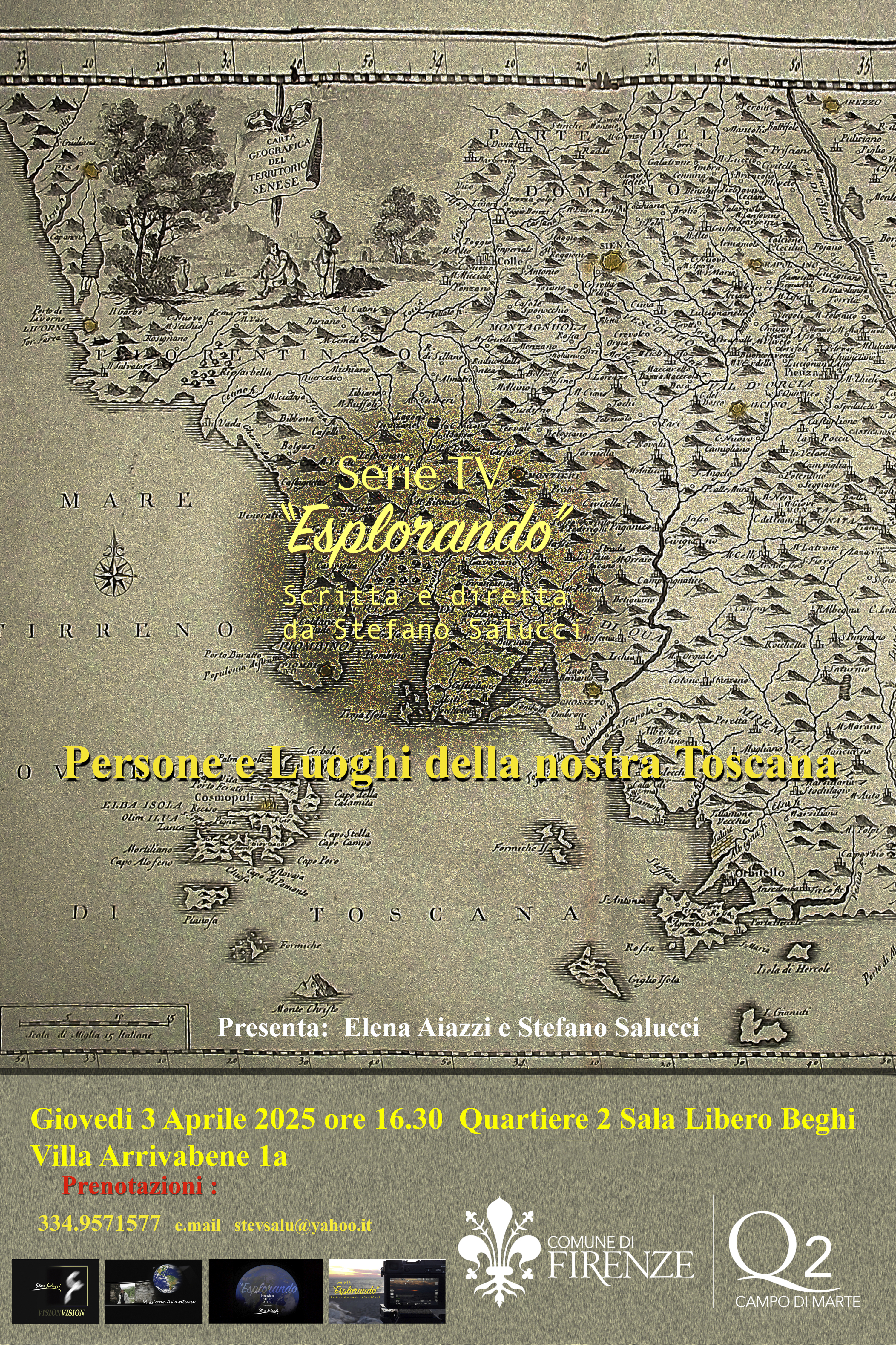 Giovedì 3 Aprile dalle ore 16.30, nella Sala Libero Beghi in Villa Arrivabene, si terrà la proiezione di quattro corti della serie "Esplorando - Persone e luoghi della nostra Toscana"; una serie di documentari scritta e realizzata da Stefano Salucci con la narrazione di Adriana Carta che vanno a scoprire le parti più remote e nascoste della nostra regione.