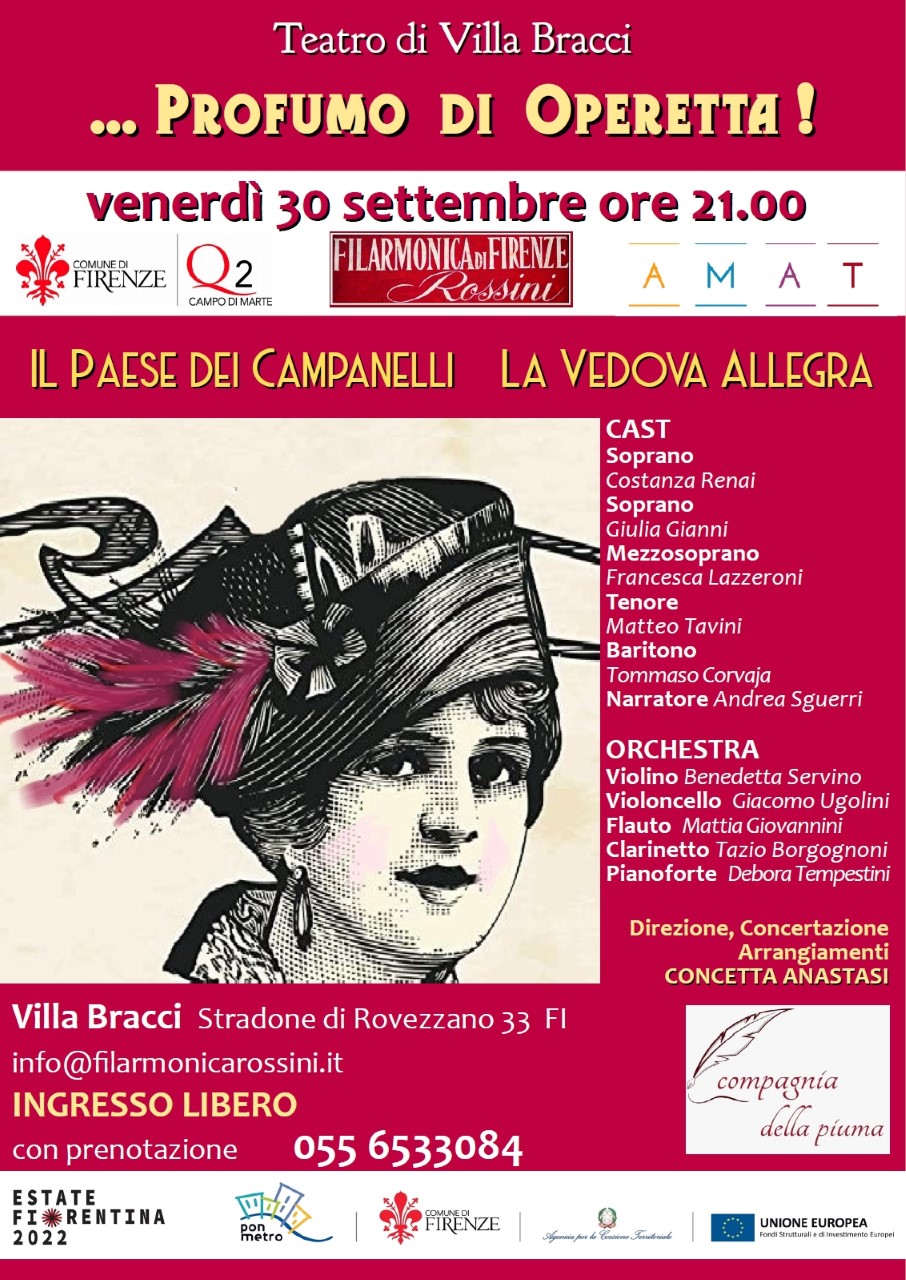 In programma una felice sintesi delle due operette più famose tra Italia e Mitteleuropa, il nostrano Paese dei Campanelli e la viennese Vedova Allegra, con musica rigorosamente dal vivo e veri artisti del belcanto. Un evento in collaborazione con Amat.lab, giovane realtà artistica a conduzione interamente femminile, e il suo progetto Compagnia della Piuma, un’idea di teatro musicale che reinventa la tradizione dell'opera lirica creando spettacoli dal taglio contemporaneo. Location il teatro di Villa Bracci, vivace luogo di incontro nel quartiere di Rovezzano dove la città incontra la campagna, animato e frequentato dai tanti soci dell’età libera.