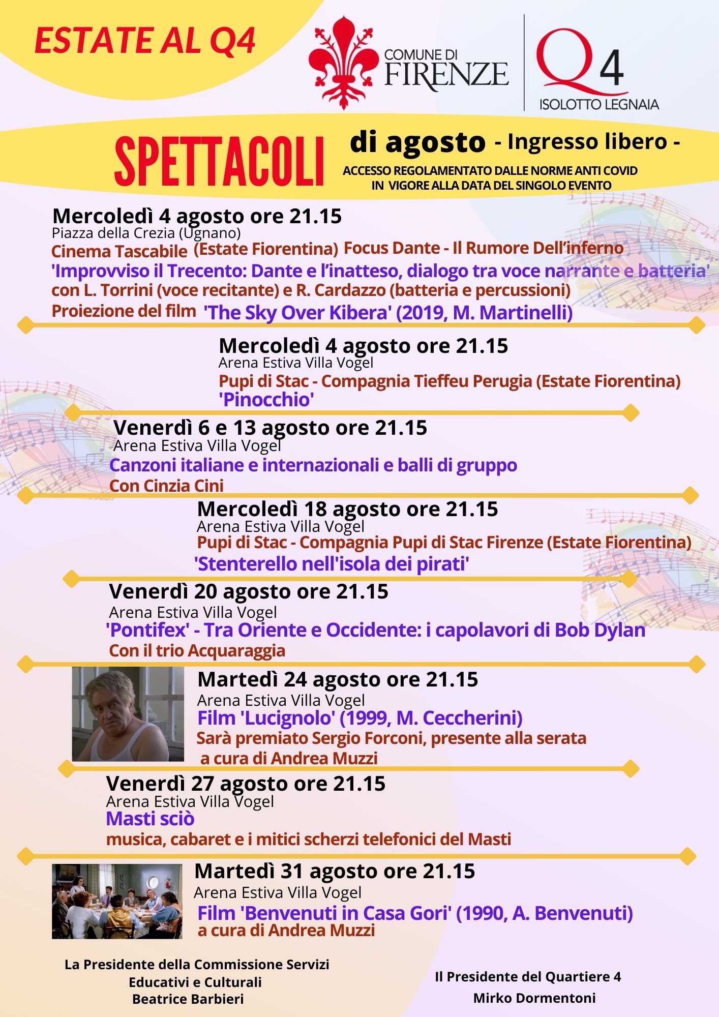La rassegna di eventi estivi del Quartiere 4 ‘Estate Q4’ prosegue nel Parco di Villa Vogel e in piazza della Crezia, a Ugnano, con ben nove eventi, alcuni a cura dell''Estate Fiorentina', altri di Sketch Spettacoli. Ci saranno incursioni inedite nell'universo dantesco e il grande cinema toscano a cura di Andrea Muzzi con la premiazione il 24 del grande Sergio Forconi. E poi il relax grazie al ballo con Cinzia Cini e alla verve del Masti, il mito Dylan, il focus sul documentario con Cinema Tascabile e i burattini dei Pupi di Stac.