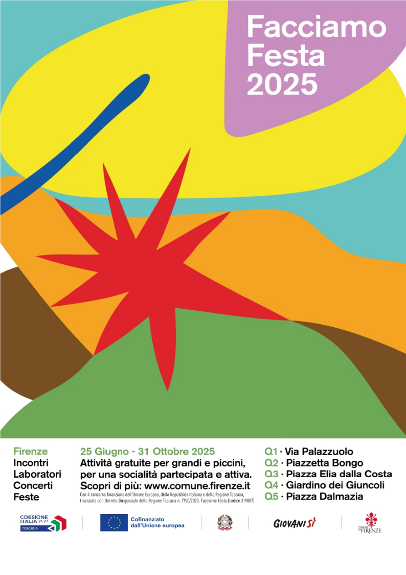 “Facciamo festa” è il progetto del Comune di Firenze, Assessorato allo Sport e alle Politiche giovanili e Assessorato alla Sicurezza urbana e Polizia municipale, finanziato dalla Regione Toscana nell’ambito dell’Avviso per la concessione di contributi agli enti locali per la realizzazione di progetti per promuovere la partecipazione attiva dei cittadini e garantire maggiori condizioni di sicurezza, nell’ambito di azioni in materia di inclusione e presidio sociale a valere sul PR FSE+ 2021-2027.