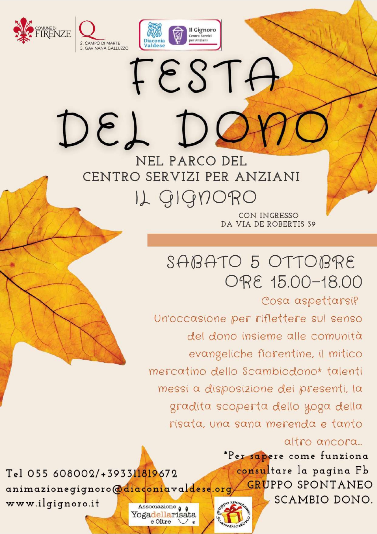 Sabato 5 Ottobre dalle ore 15.00 alle ore 18.00, presso il Centro servizi per anziani "Il Gignoro", si terrà la Festa del Dono, un'occasione per riflettere sul senso del dono insieme alle comunità evangeliche fiorentine attraverso il mitico mercatino dello Scambiodono e le tante attività che accompagneranno l'iniziativa.