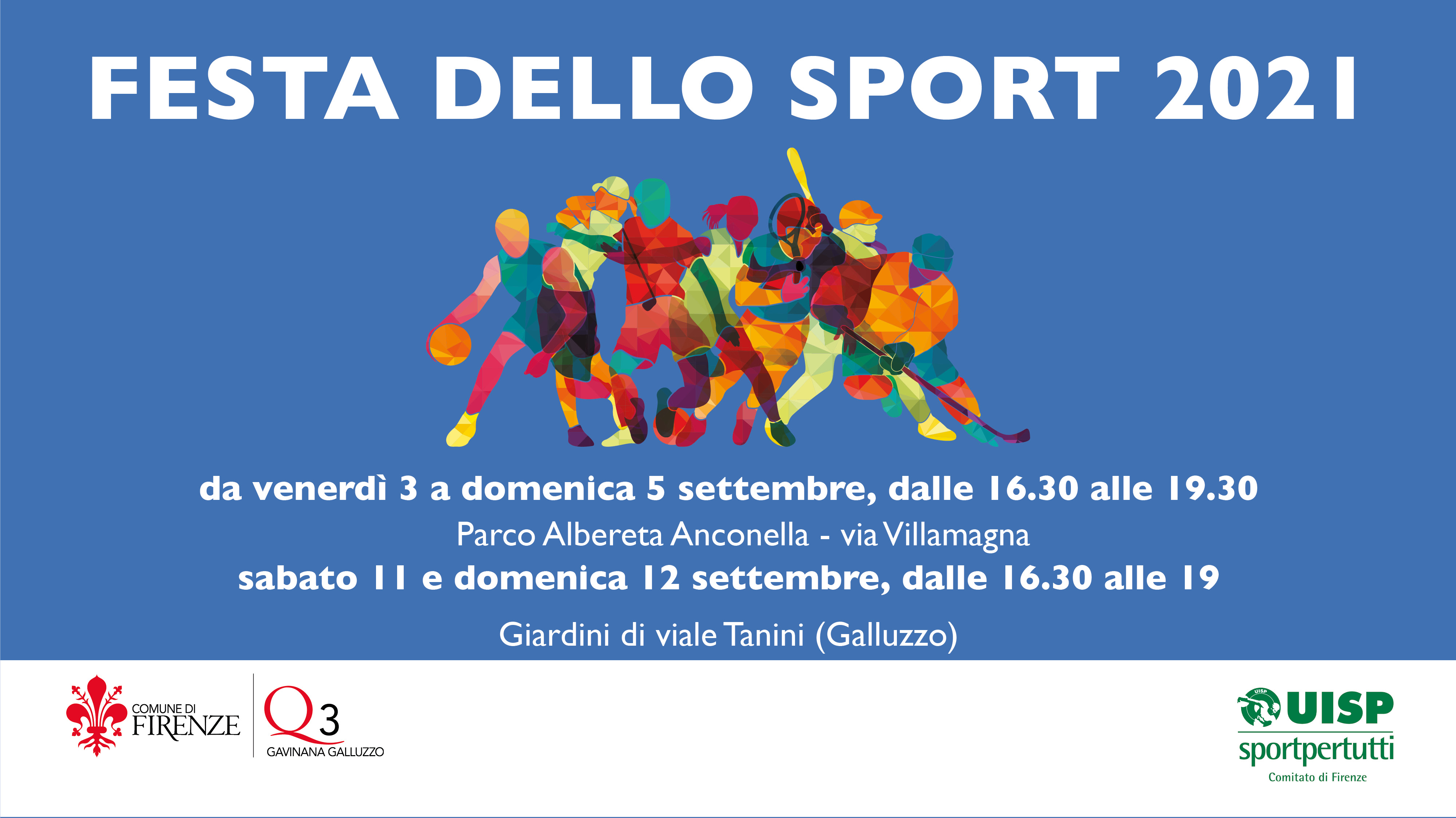 Anche quest’anno il Consiglio di Quartiere 3 propone la Festa dello Sport “Gioca lo Sport” al parco dell’Anconella, nei giorni di venerdì 3, sabato 4 e domenica 5 settembre; la manifestazione verrà riproposta, dopo tanto tempo di assenza, nei giorni di sabato 11 e domenica 12 settembre nell’area del Viale Tanini al Galluzzo con orario, per entrambi gli appuntamenti 16.30-19.