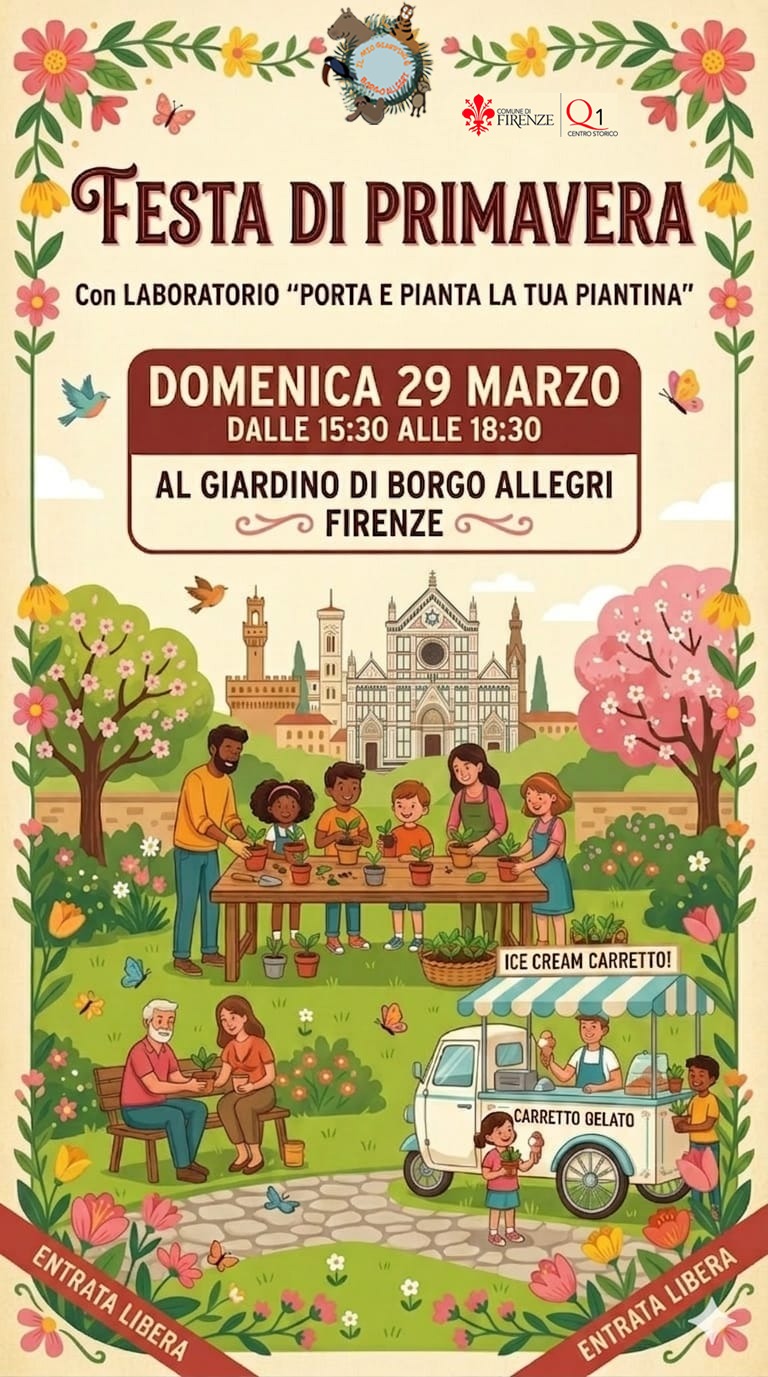 Festa di Primavera del Giardino di Borgo Allegri: alle ore 15.30 laboratorio di giardinaggio: ogni bambino potrà portare la propria piantina e metterla a dimora nelle aiuole già predisposte nel giardino, a seguire verrà offerta una merenda a base di gelato. La giornata si chiuderà alle 18.30, orario di chiusura. L'entrata alla festa è libera.