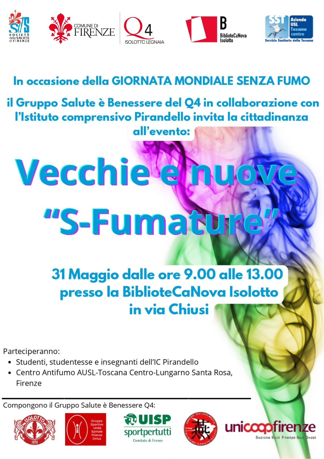 Il Gruppo Salute è Benessere del Q4 insieme agli studenti e insegnanti dell’IC Pirandello ed il centro Antifumo Ausl Tosana centro – Lungarnno Santa Rosa, in occasione della giornata mondiale antifumo invita la cittadinanza ad un incontro che si terrà venerdì 31 maggio presso la BiblioteCaNova Isolotto di Via Chiusi, alle ore 9. Il programma nelle locandine in allegato.
