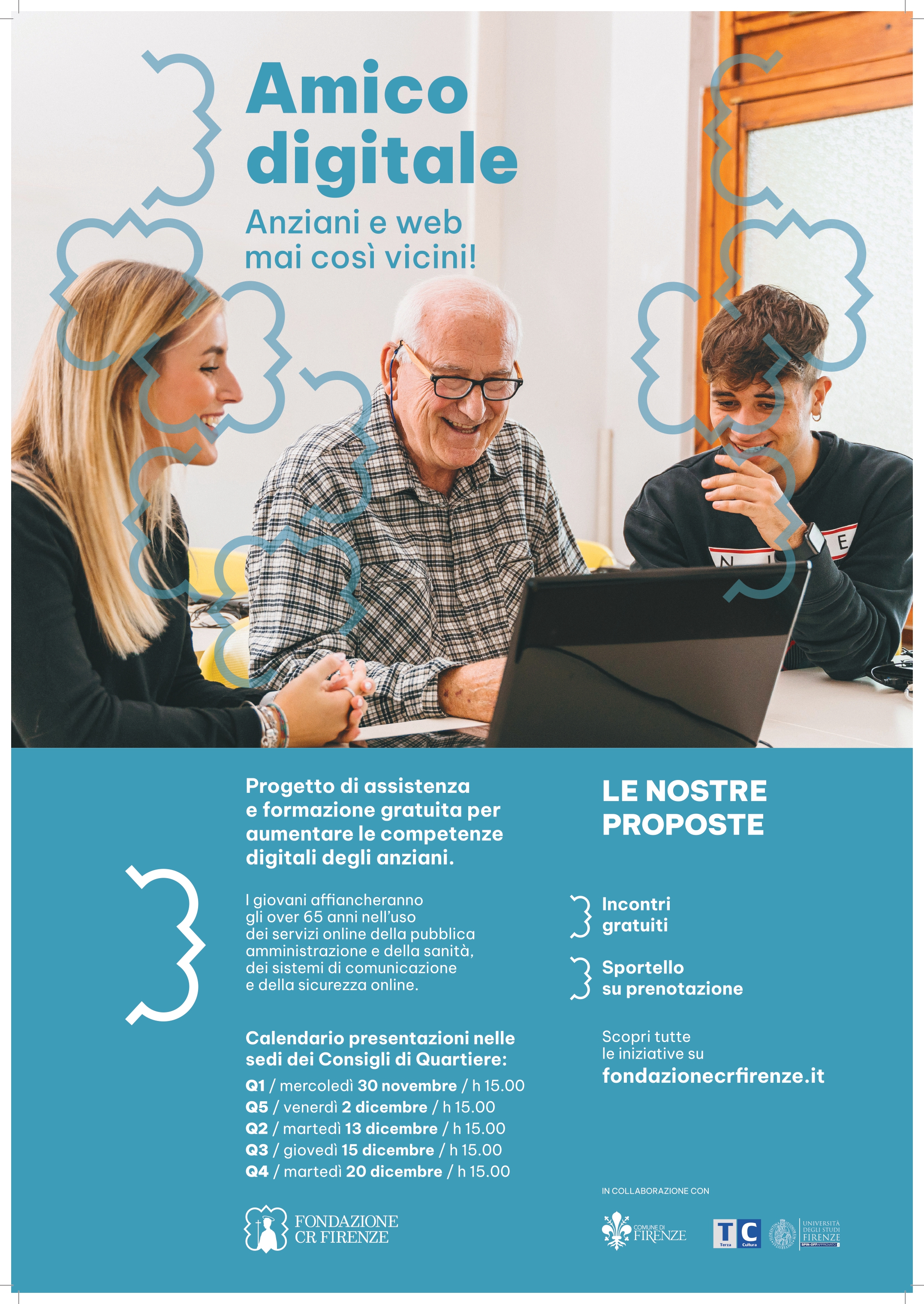 Al via le presentazioni nelle sedi dei cinque Quartieri del progetto "AMICO DIGITALE", che fornirà assistenza e formazione gratuita per aumentare la conoscenza digitale agli over 65. Attraverso il nuovo sportello gratuito, gli over 65 saranno affiancati dai giovani collaboratori che li aiuteranno dell'uso dei servizi online della pubblica amministrazione e della sanità, nonché dei sistemi di comunicazione e della sicurezza online.