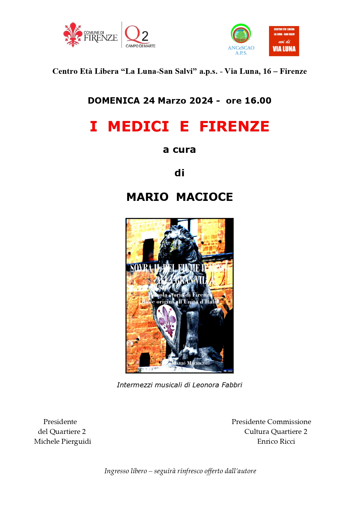 Domenica 24 marzo alle ore 16:00, presso il Centro Età Libera "La Luna - San Salvi", si terrà l'incontro "I Medici e Firenze" a cura di Mario Macioce durante il quale si parlerà della storia di Firenze dalle origini all'Unità d'Italia. Sarà presente anche Leonora Fabbri che accompagnerà l'incontro con intermezzi musicali.