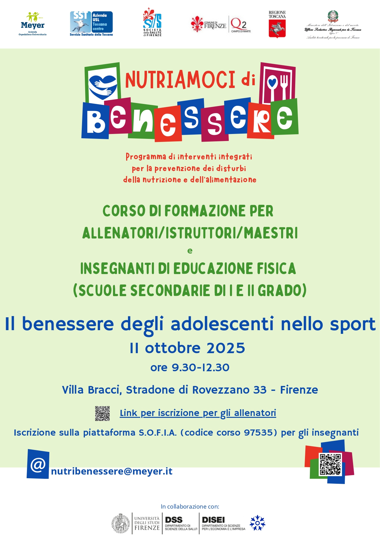 Nuovo corso di formazione dal titolo "Il benessere degli adolescenti nello sport", rivolto agli allenatori/istruttori/maestri delle associazioni e società sportive del Quartiere 2, area pilota del programma, e allargato agli insegnanti di educazione fisica delle scuole secondarie di I e II grado dello stesso quartiere coinvolte attivamente nel programma, organizzato nell'ambito del programma "Nutriamoci di benessere" per la prevenzione dei disturbi della nutrizione e dell'alimentazione tra i ragazzi e le ragazze in età compresa tra 11 e 13 anni, promosso dall’AOU Meyer IRCCS, l’Azienda USL Toscana Centro e la Società della Salute di Firenze, in collaborazione con l’Ufficio Scolastico Regionale e dell’ambito territoriale di Firenze, il Dipartimento di Scienze della Salute e il Dipartimento di Scienze per l’Economia e l’Impresa dell’Università di Firenze e la pediatria di famiglia.