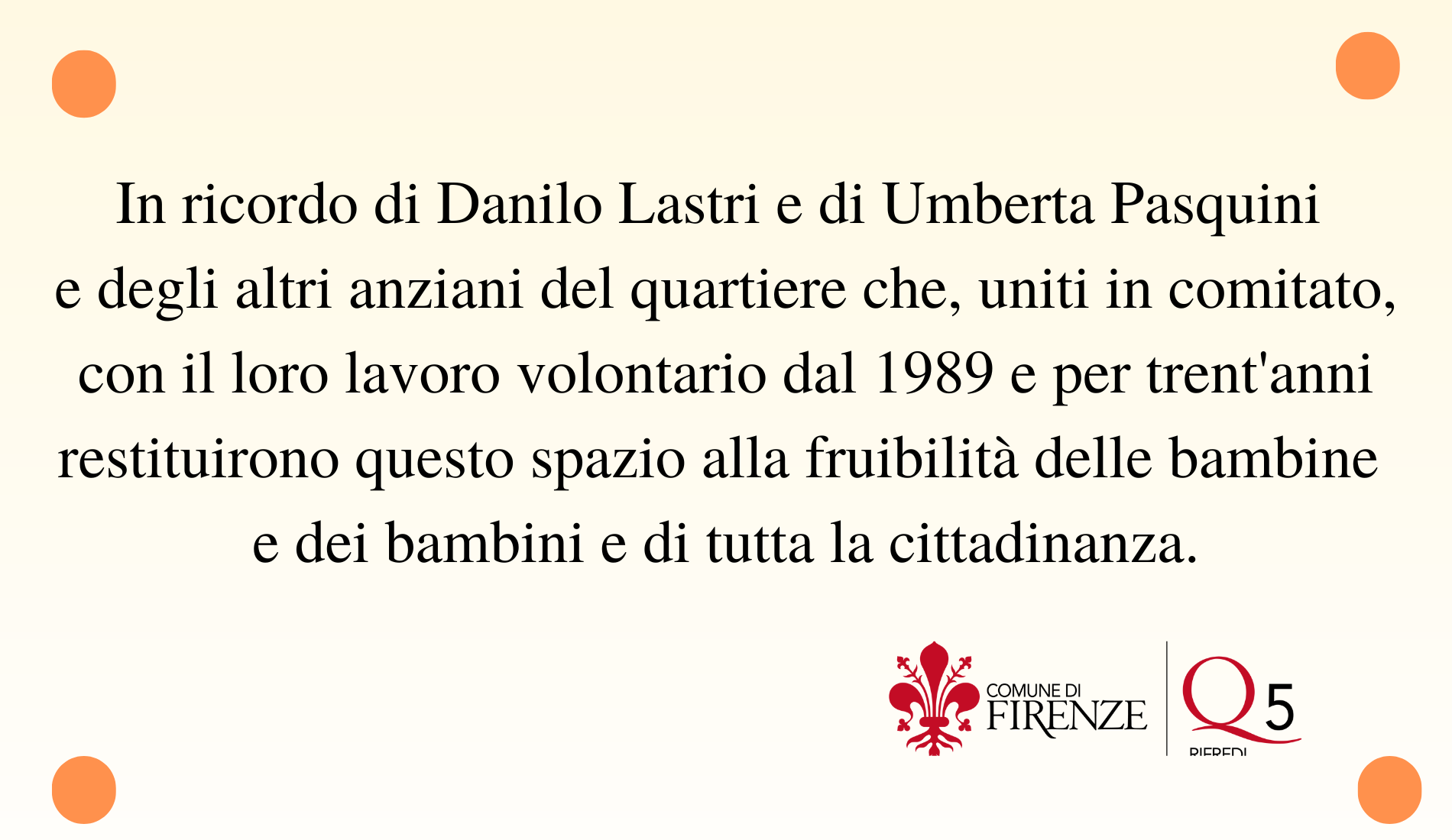 La figlia di Danilo e Umberta, Daniela Lastri, ex Assessora del Comune di Firenze, ha deciso di dedicare una targa al lavoro e alla cura dedicata dai suoi genitori e da coloro che facevano parte del Comitato di Villa Ruspoli e che hanno riportato a nuova vita questo giardino.