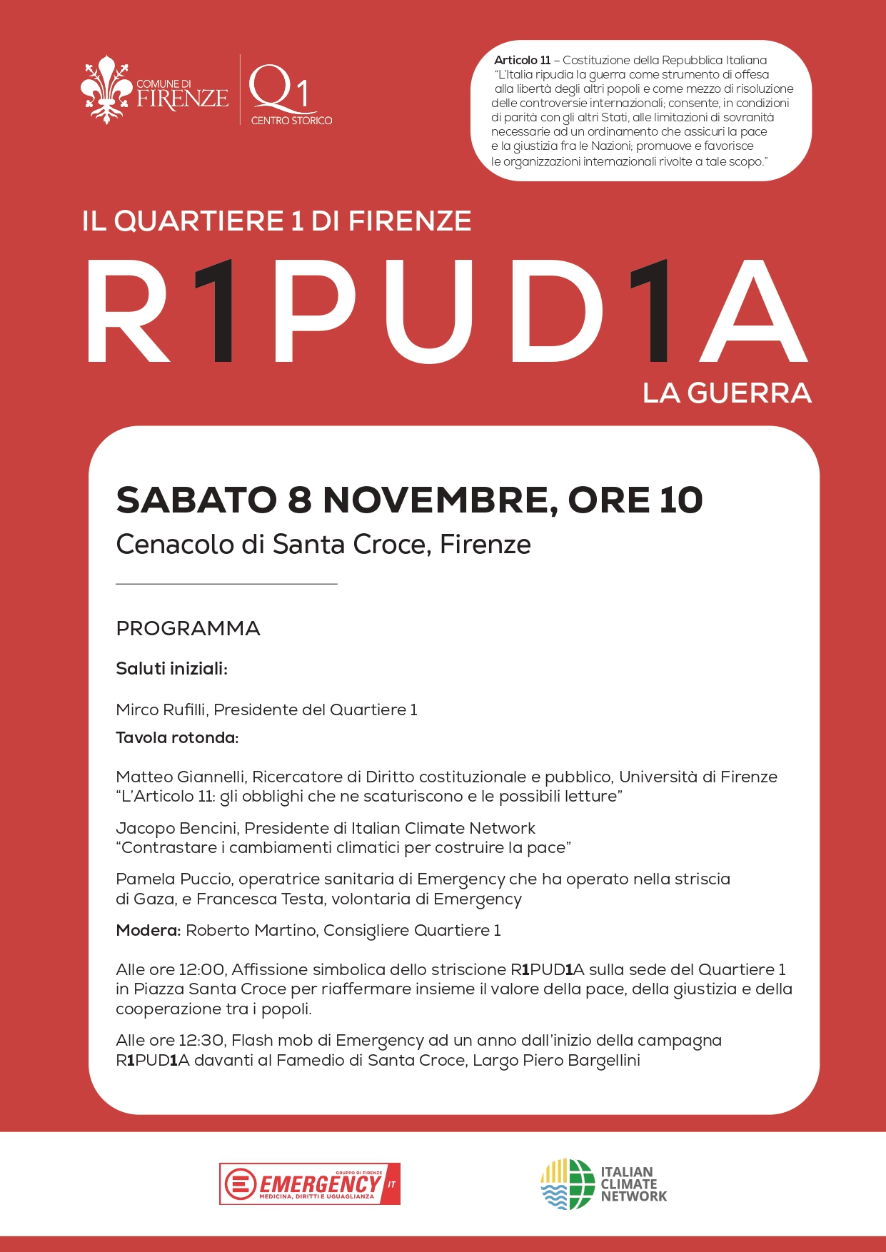 Lo striscione di Emergency con la scritta R1PUD1A sarà affisso sabato 8 novembre alle ore 12.00 davanti a Palazzo Cocchi Serristori, Piazza Santa Croce 1, sede del Consiglio di Quartiere 1
