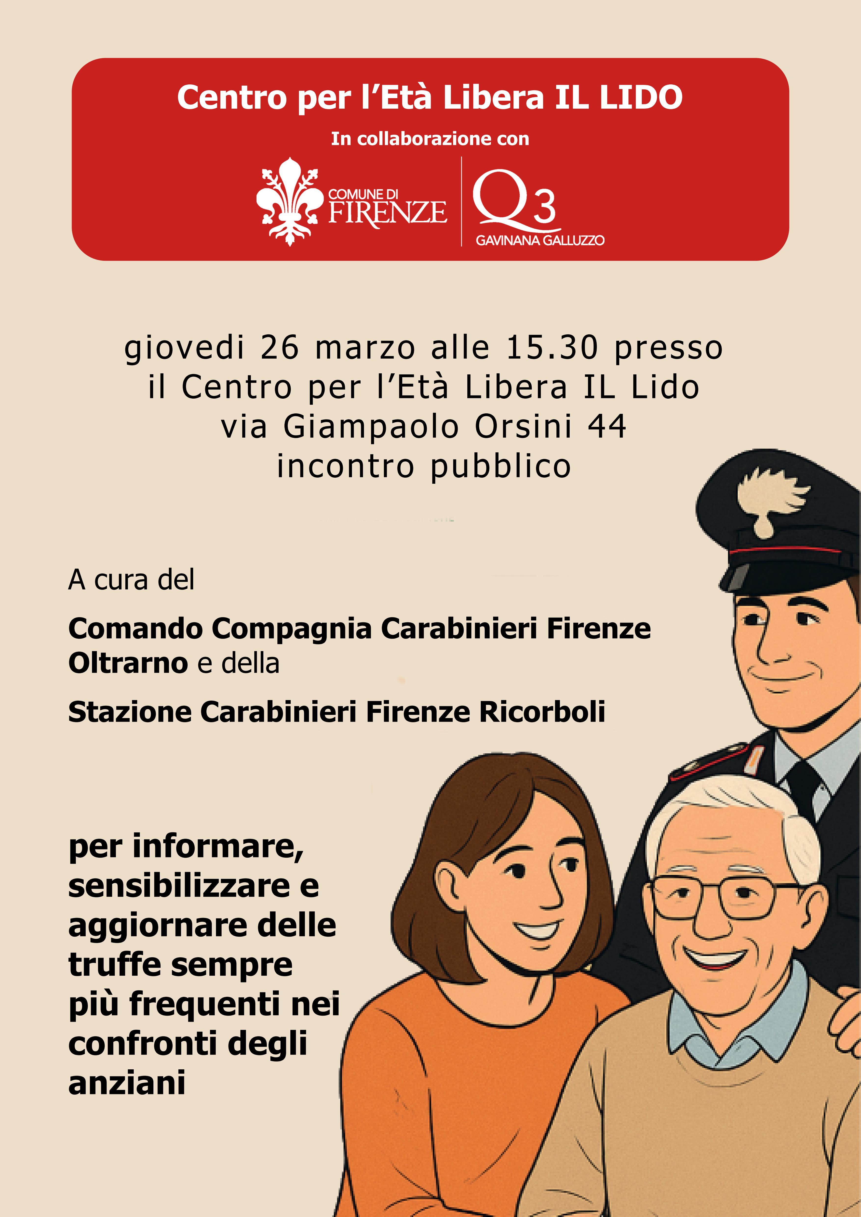 Giovedì 26 marzo alle ore 15.30 presso il Centro per l’Età Libera IL Lido in via Giampaolo Orsini 44 si terrà un incontro pubblico a cura del Comando Compagnia Carabinieri Firenze Oltrarno e della Stazione Carabinieri Firenze Ricorboli per informare, sensibilizzare e aggiornare sulle truffe sempre più frequenti nei confronti degli anziani.