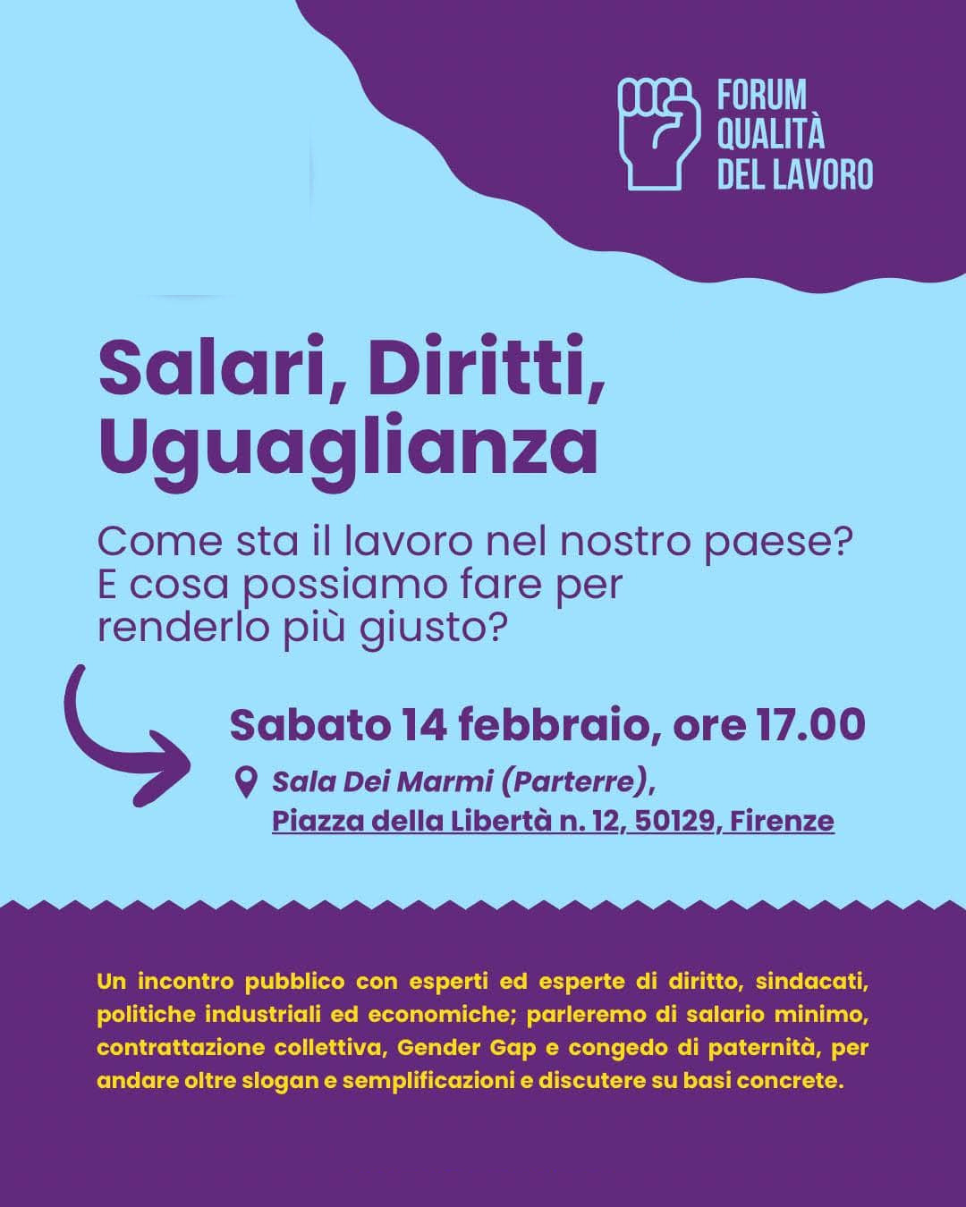 Sabato 14 Febbraio alle ore 17.00, nella Sala dei Marmi al Parterre, si terrà l'incontro pubblico dal titolo "Salari, diritti, uguaglianza"; una discussione che affronterà, con l'ausilio di esperti, tematiche di diritto, politiche industriali ed economiche, ma anche contrattazione collettiva, gender gap, congedo di paternità e altro ancora.