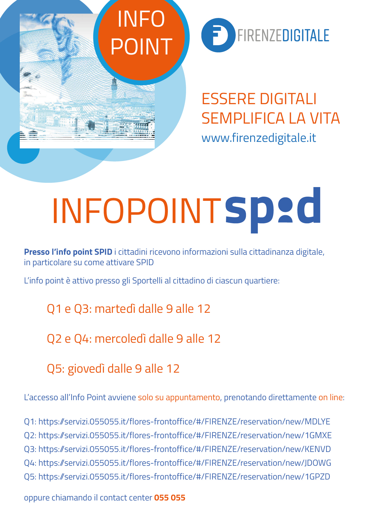 Per affiancare il cittadino nel passaggio ai nuovi strumenti di identità digitale sono stati attivati i nuovi Infopoint Firenze Digitali nei quartieri, che hanno offerto ai cittadini tutte le informazioni necessarie all’attivazione dell’identità digitale Spid. Per proseguire il servizio gli sportelli saranno nuovamente attivi dal 2 novembre al 30 dicembre 2021.
