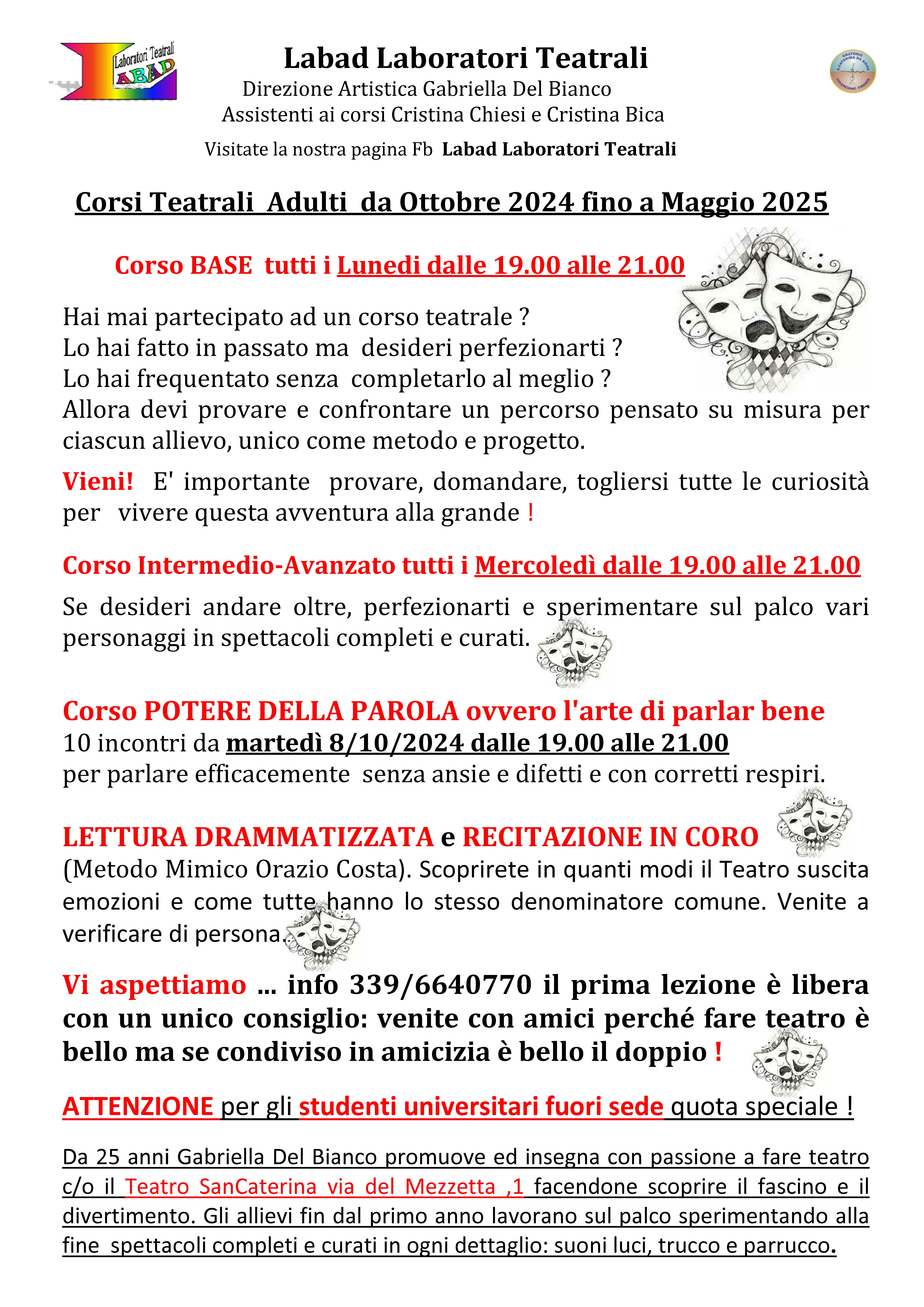 Tornano per il 2024 e 2025 i corsi organizzati da Labad Laboratori Teatrali, con un'offerta che spazia dalla recitazione in coro alla lettura drammatizzata fino al potere della parola per parlare efficacemente; tre giorni di festa, il 18, il 19 ed il 26 Settembre al Teatro SanCaterina tra lezioni aperte, laboratori e performance dal vivo per presentare la nuova stagione di corsi.