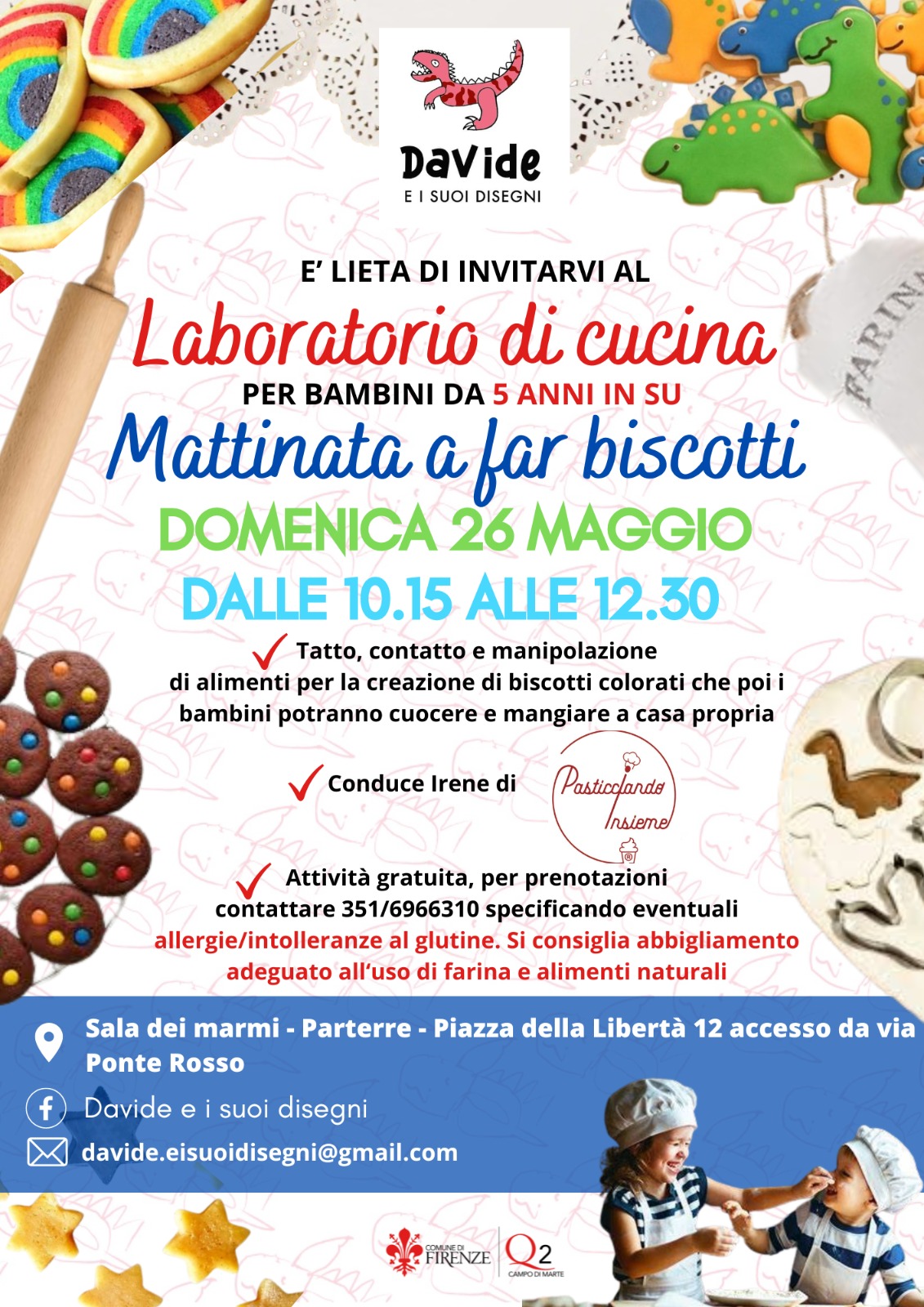 Domenica 26 maggio dalle ore 10:15 alle ore 12:30, "Davide e i suoi disegni", terrà un laboratorio di cucina per bambini da 5 anni in su, presso la Sala dei Marmi in Piazza della Libertà, chiamato "Mattinata a far biscotti". I bambini avranno la possibilità di stare a contatto con alimenti e manipolarli per la creazione di biscotti colorati che poi potranno cuocere e mangiare a casa propria. Il laboratorio sarà condotto da Irene di "Pasticciando Insieme".