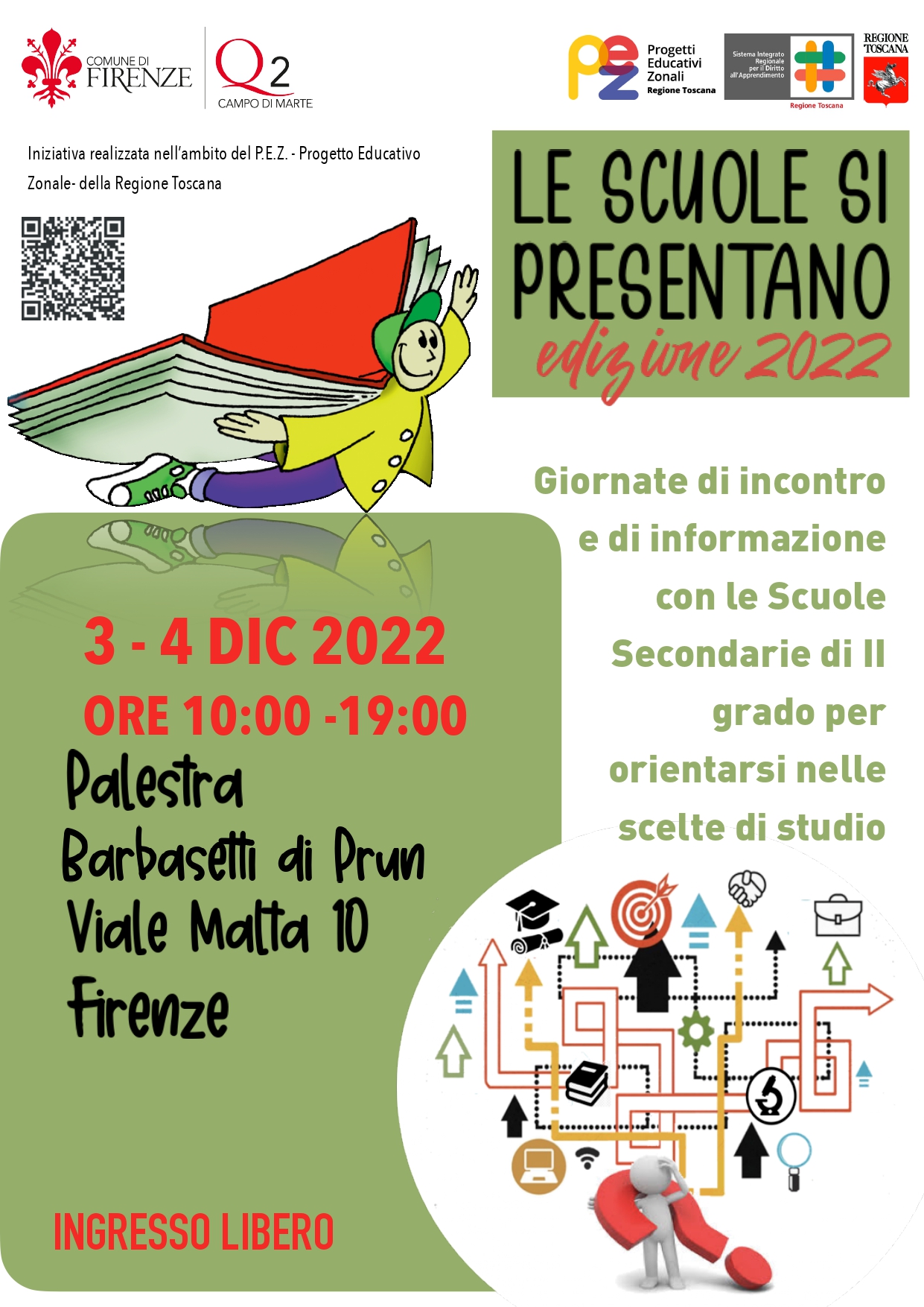 Il 3 ed il 4 Dicembre dalle ore 10.00 alle ore 19.00, nella palestra Barbasetti di Prun, in Viale Malta n.10, si terrà l'Edizione 2022 de "Le scuole si presentano"; due giornate di incontro e di informazione con le Scuole Secondarie di II grado per consentire a tutti gli studenti di classe terza delle Scuole secondarie di primo grado di Firenze e della Città metropolitana di orientarsi al meglio nelle scelte di studio.