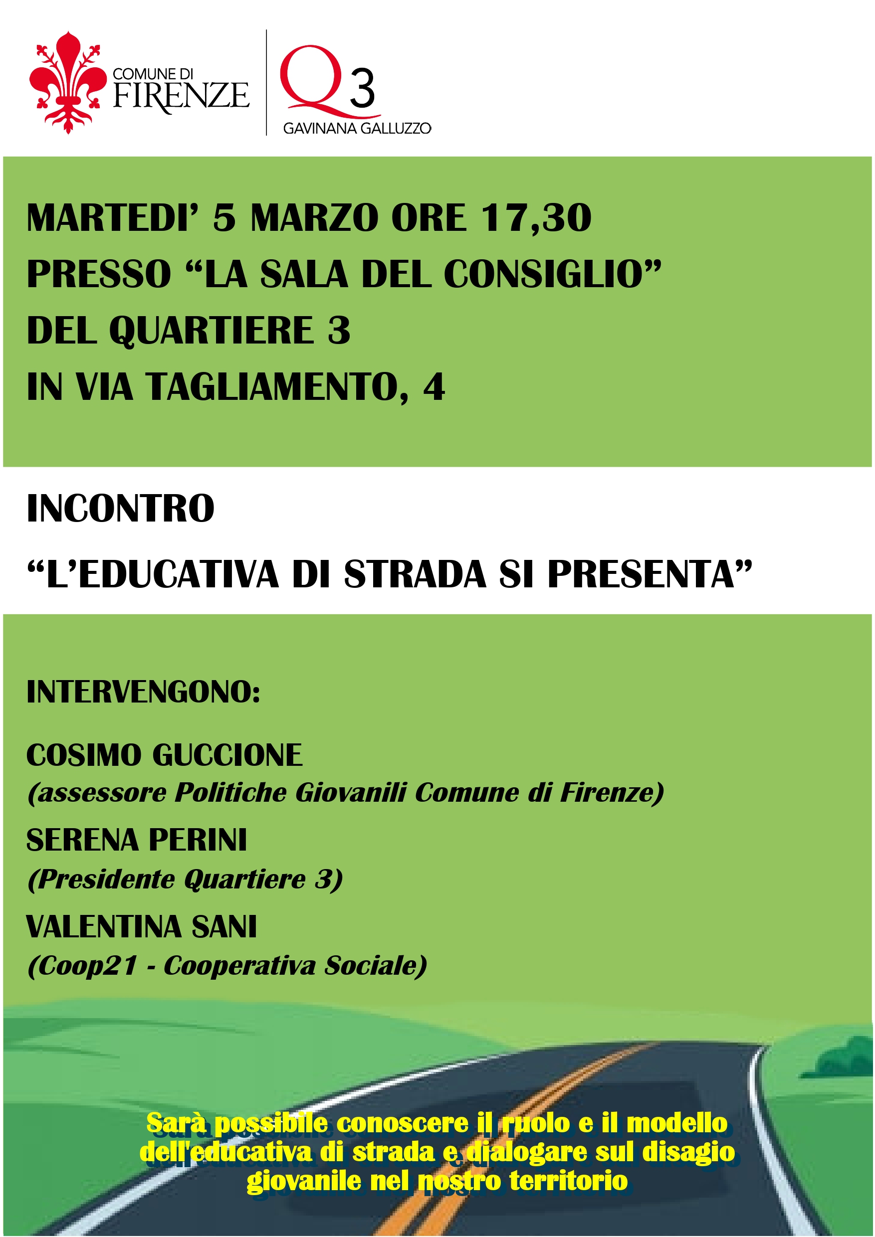 Martedì 5 marzo 2024 alle ore 17.30 presso la sala consiliare del Quartiere 3 si terrà un incontro per presentare il servizio di educativa di strada, per capirne meglio il ruolo ed il modello e dialogare sul disagio giovanile del nostro territorio.