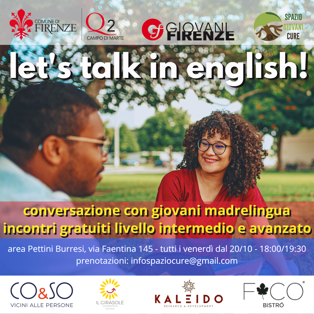Da venerdì 20 ottobre in orario 18:00/19:30, presso lo Spazio Giovani Cure all'Area Pettini Burresi, ripartono gli incontri di conversazione in inglese con giovani madrelingua, grazie a una collaborazione con The College of the Holy Cross Firenze; una serie di incontri rivolti a persone che vogliano migliorare il proprio livello di inglese attraverso la conversazione.