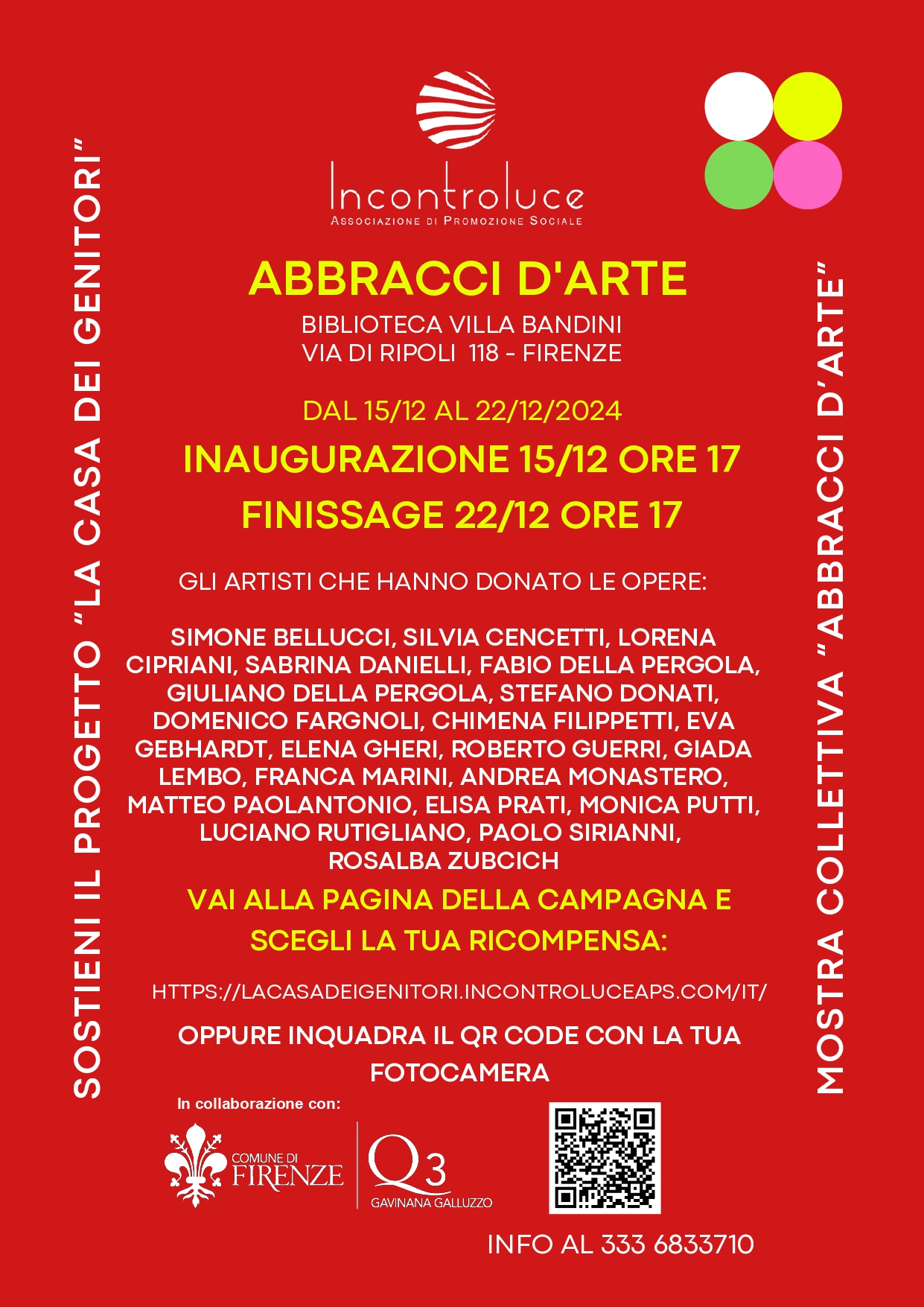 Esposizione di opere d'arte degli artisti che hanno aderito alla proposta di sostenere il progetto della "Casa dei Genitori", mediante la donazione di proprie opere. Al termine della mostra le opere saranno usate come ricompense per le donazioni in favore del progetto in questione, un progetto innovativo che si propone di creare uno spazio dedicato al sostegno e all'accompagnamento dei neo-genitori e delle famiglie con bambini fino a tre anni, attraverso un'offerta di servizi integrata, che include ascolto e orientamento, consulenze specialistiche, laboratori espressivi e occasioni di condivisione tra genitori.