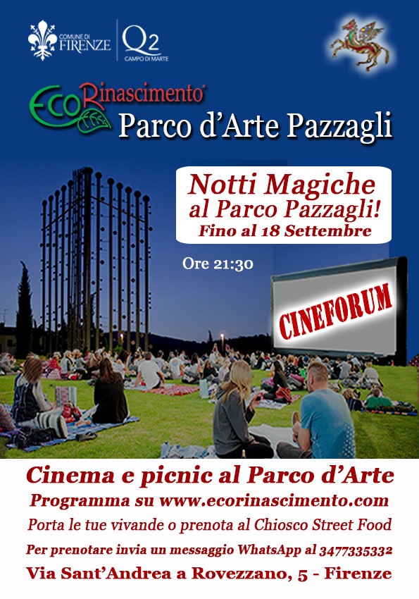 Al Parco d'Arte Pazzagli a Sant'Andrea a Rovezzano torna la quinta edizione delle "Notti Magiche", la rassegna di cinema e picnic all’aperto tra arte e cultura, a cura dell'Arch. Massimiliano Silvestri ed Elisa Amerena dell’Associazione “EcoRinascimento” e dell'Ing. Marco Frittelli dell’Associazione “Bottega del Cinema”.
