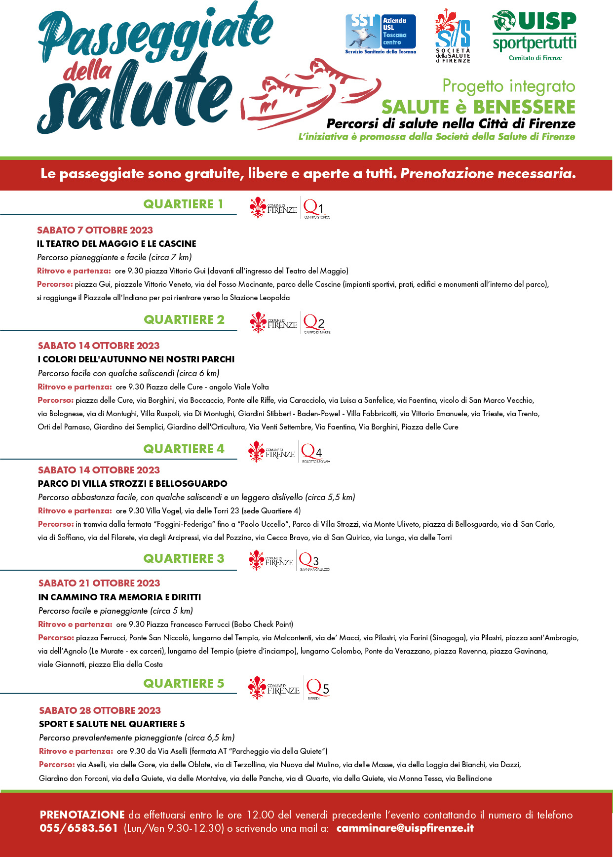 Riprendono ad Ottobre 2023 le passeggiate gratuite organizzate dalla UISP Firenze nei Quartieri Fiorentini, con cinque nuovi appuntamenti nei quattro sabati del mese; per partecipare è obbligatoria la prenotazione, da effettuare telefonicamente al numero 0556583561 o tramite mail all'indirizzo camminare@uispfirenze.it.