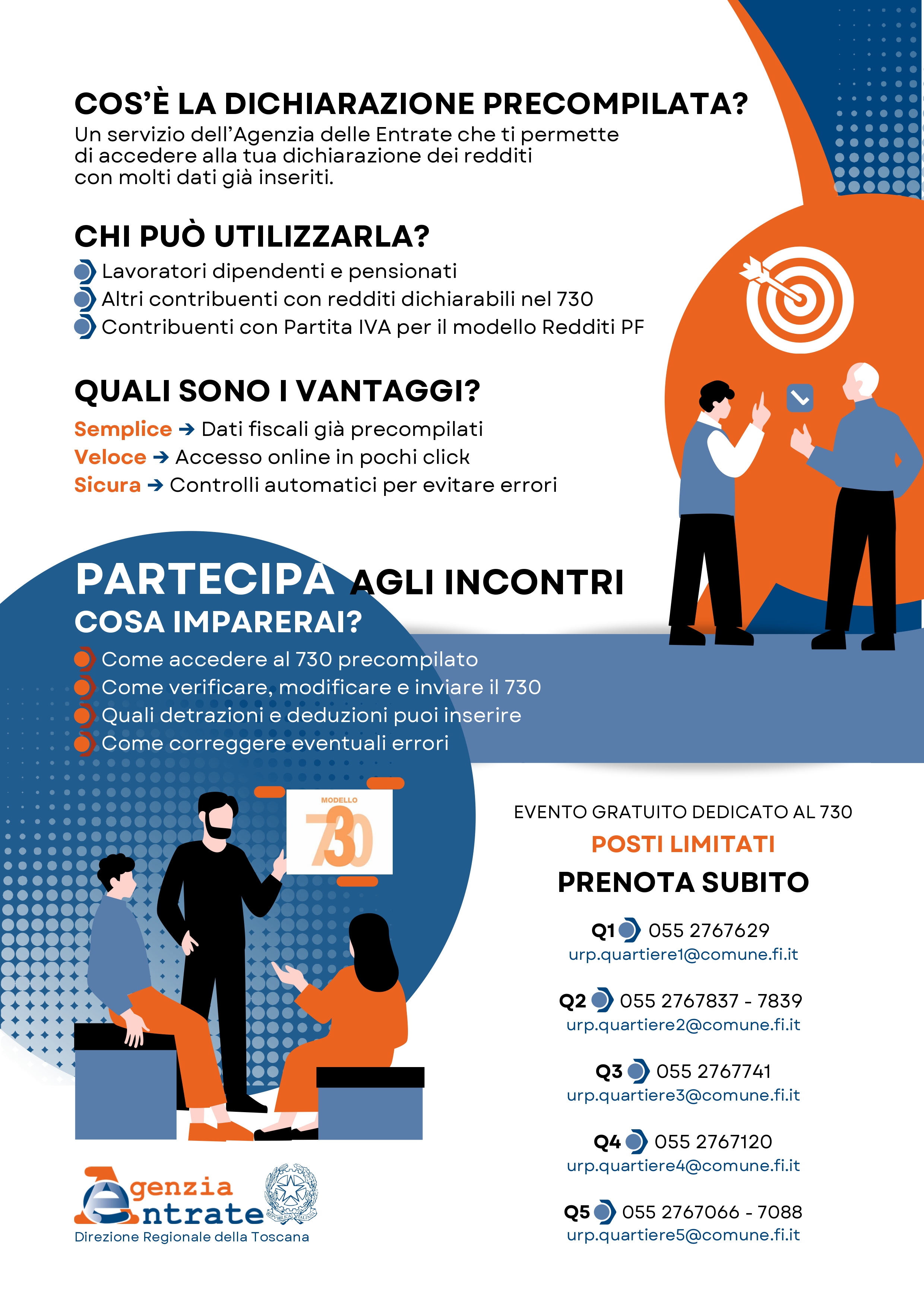 Con Precompilata 2025 semplice, veloce, sicura, ciclo di incontri di avvicinamento al “fisco digitale” presso i Quartieri di Firenze, l’Agenzia delle Entrate mostrerà ai partecipanti come accedere al 730 precompilato, come verificare, modificare e inviare il 730, quali detrazioni e deduzioni si potranno inserire e come correggere eventuali errori.