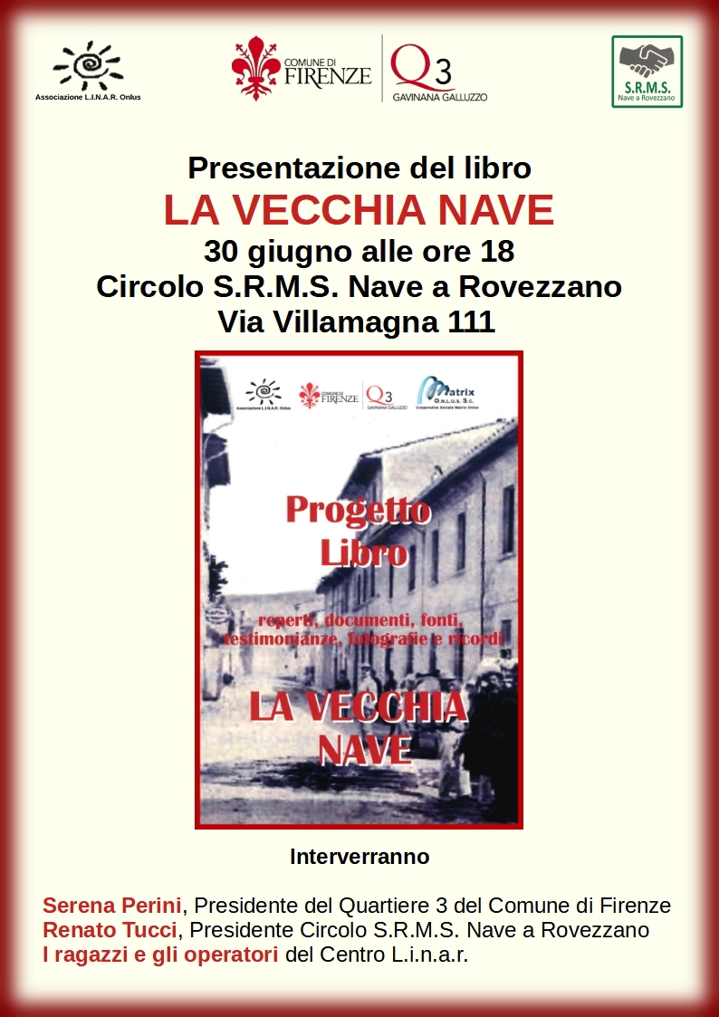 Il Quartiere 3 ha pubblicato il libro “La vecchia nave” in cui sono raccolti - con collaborazione del Centro L.i.n.a.r. - documenti, aneddoti, reperti, fonti, testimonianze, fotografie, ricordi sull’identità del borgo di Nave a Rovezzano attraverso la sua storia degli ultimi 50 o 60 anni e non solo. Il 30 giugno alle ore 18 presso il circolo S.R.M.S. alla Nave a Rovezzano, in Via Villamagna 111, si terrà la presentazione di detta opera con interventi della Presidente del Quartiere 3 Serena Perini, di Renato Tucci, Presidente Circolo S.R.M.S. Nave a Rovezzano, dei ragazzi e degli operatori del Centro L.i.n.a.r.