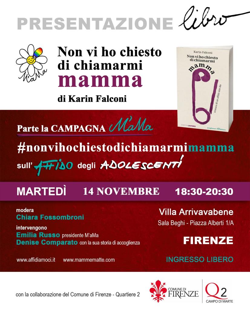 Il 14 novembre, dalle ore 18:30 alle ore 20:30, presso la Sala Beghi in Villa Arrivabene, avrà luogo la presentazione del libro "Non vi ho chiesto di chiamarmi mamma" di Karin Falconi per dare il via alla campagna M'aMa. Il libro tratta in modo approfondito il tema dell'affido degli adoloscenti, offrendo un'occasione per esplorare narrativa e riflessioni legate a questa tematica.