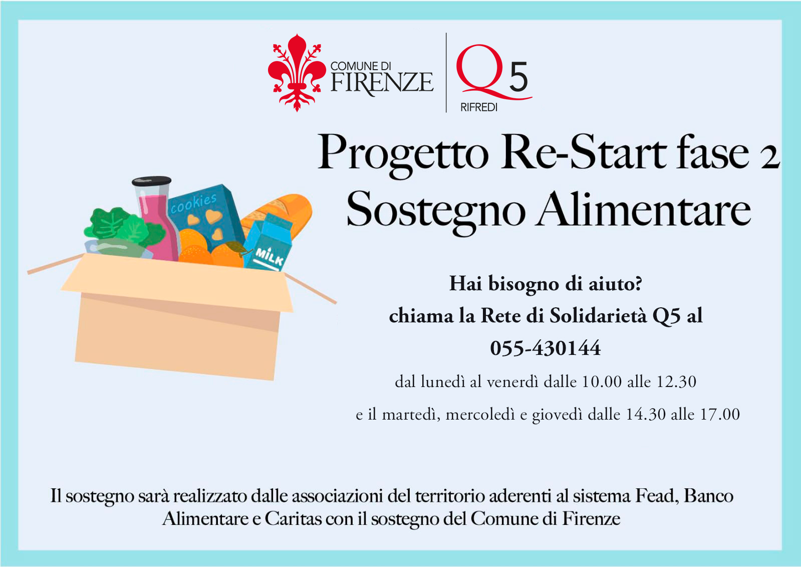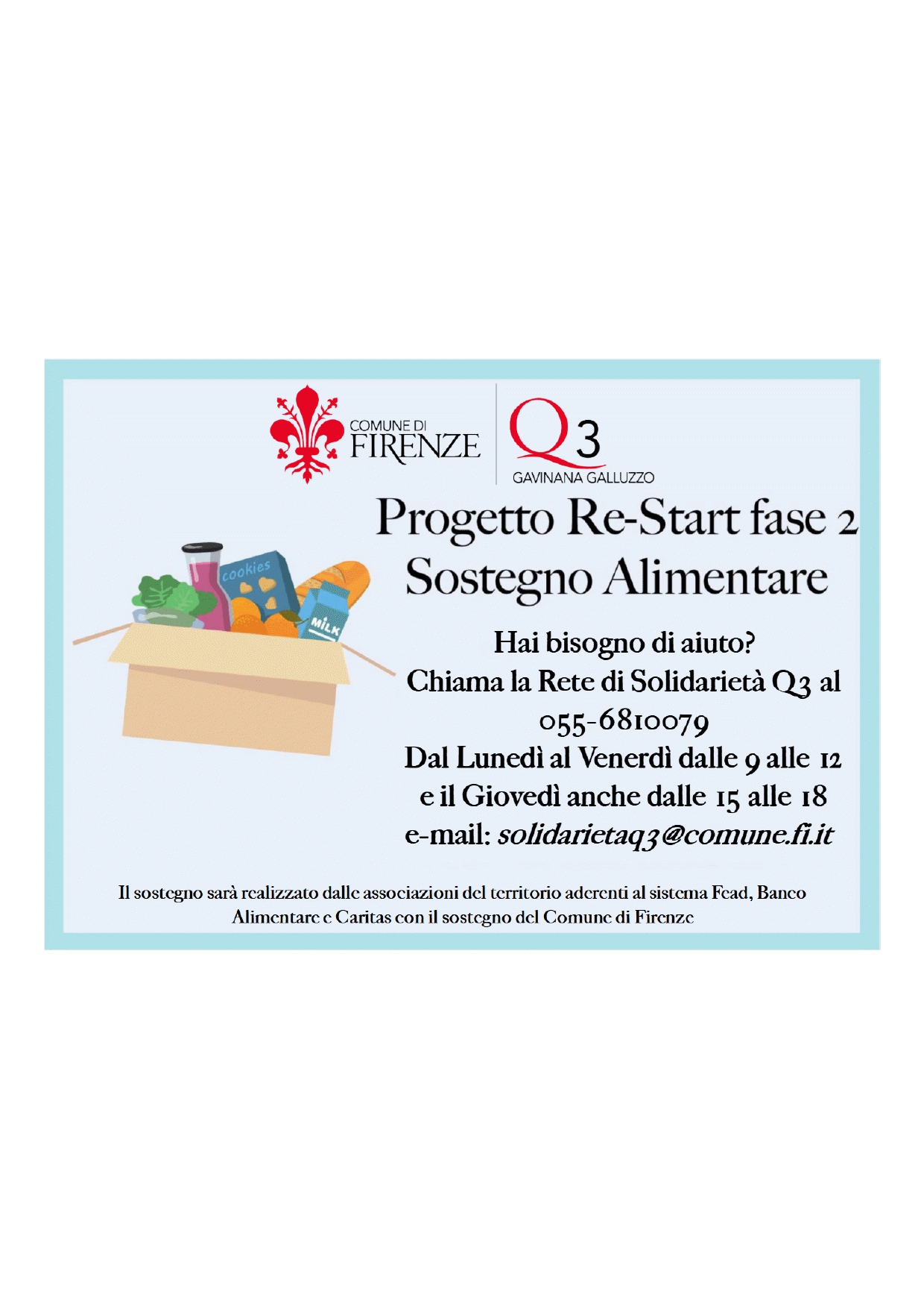 Il progetto ‘Re-Start prevede, fino al 30 aprile prossimo, la distribuzione dei pacchi alimentari ai fiorentini in difficoltà, anche a causa dell’emergenza Covid-19. La distribuzione avverrà in collaborazione con le Reti di Solidarietà dei Quartieri, che si avvarranno della collaborazione di 43 Associazioni di Volontariato cittadine, le quali avranno la funzione di punti di distribuzione riforniti da Caritas e Banco Alimentare iscritti al portale del Fondo di Aiuti Europei agli Indigenti (FEAD).