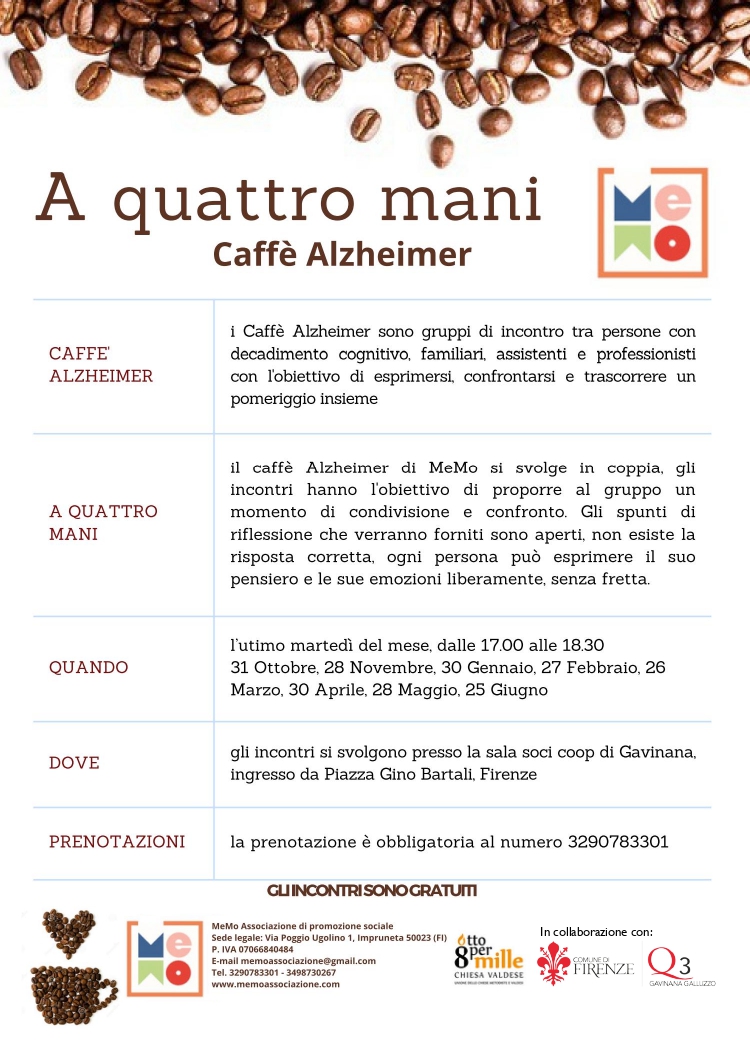 Dal 31 ottobre inizierà il progetto "A quattro mani", il primo caffè Alzheimer del Quartiere 3 che si terrà tutti gli ultimi martedì del mese presso la sala soci Coop di Gavinana. Gli incontri sono rivolti alle persone con decadimento cognitivo e alle loro famiglie con l'obbiettivo di esprimersi e confrontarsi per trascorrere un pomeriggio di condivisione. Gli incontri sono completamente gratuiti grazie al finanziamento di 8permille della Chiesa Valdese.