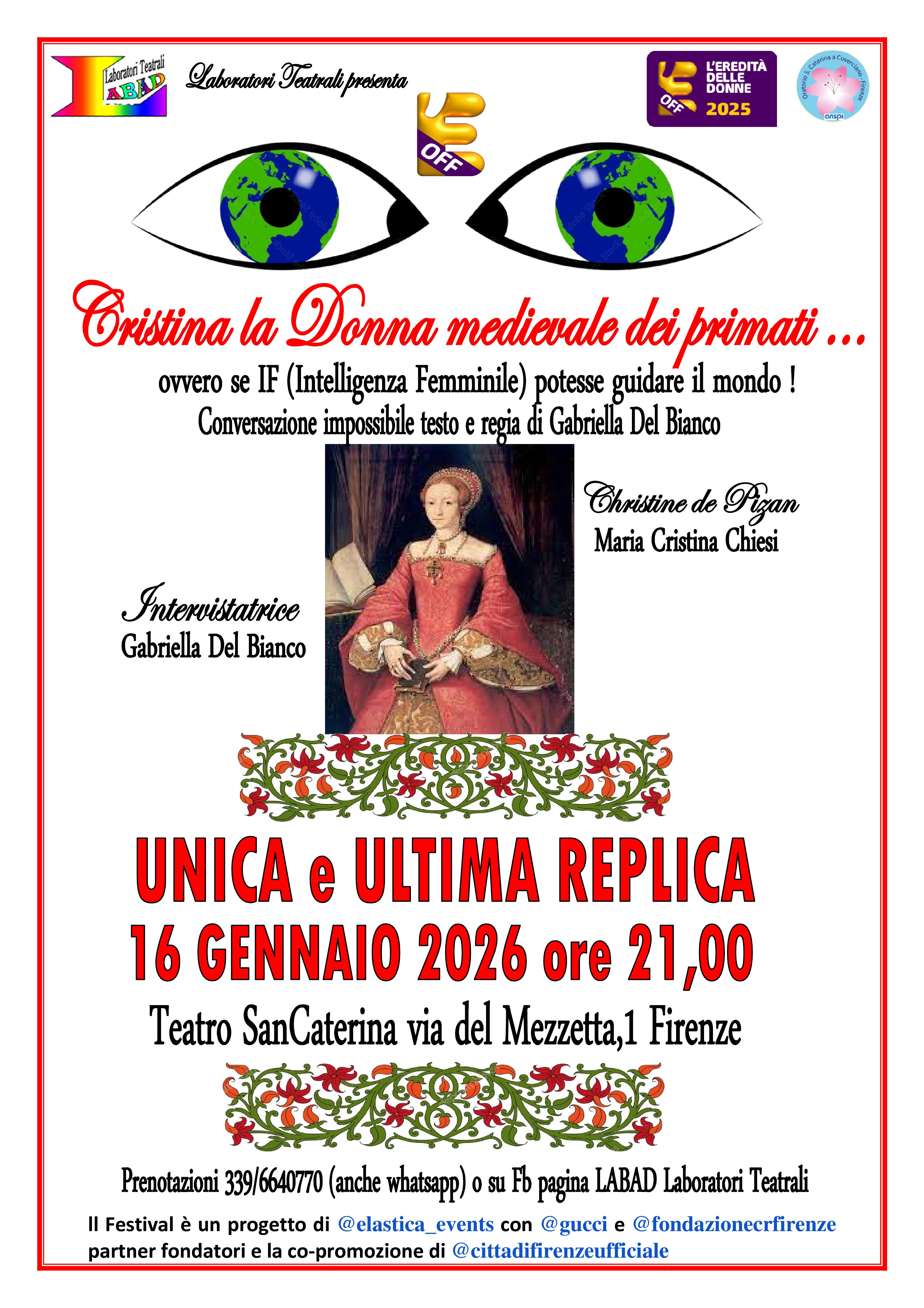 Ultima replica dello spettacolo teatrale portato in scena al teatro SanCaterina a Novembre 2025, a cura di Labad Laboratori Teatrali e inserito nel Festival Eredità delle Donne; un atto unico scritto e diretto da Gabriella Del Bianco con Maria Cristina Chiesi che ripercorre l'affascinante e complicata vita di Christine de Pizan.