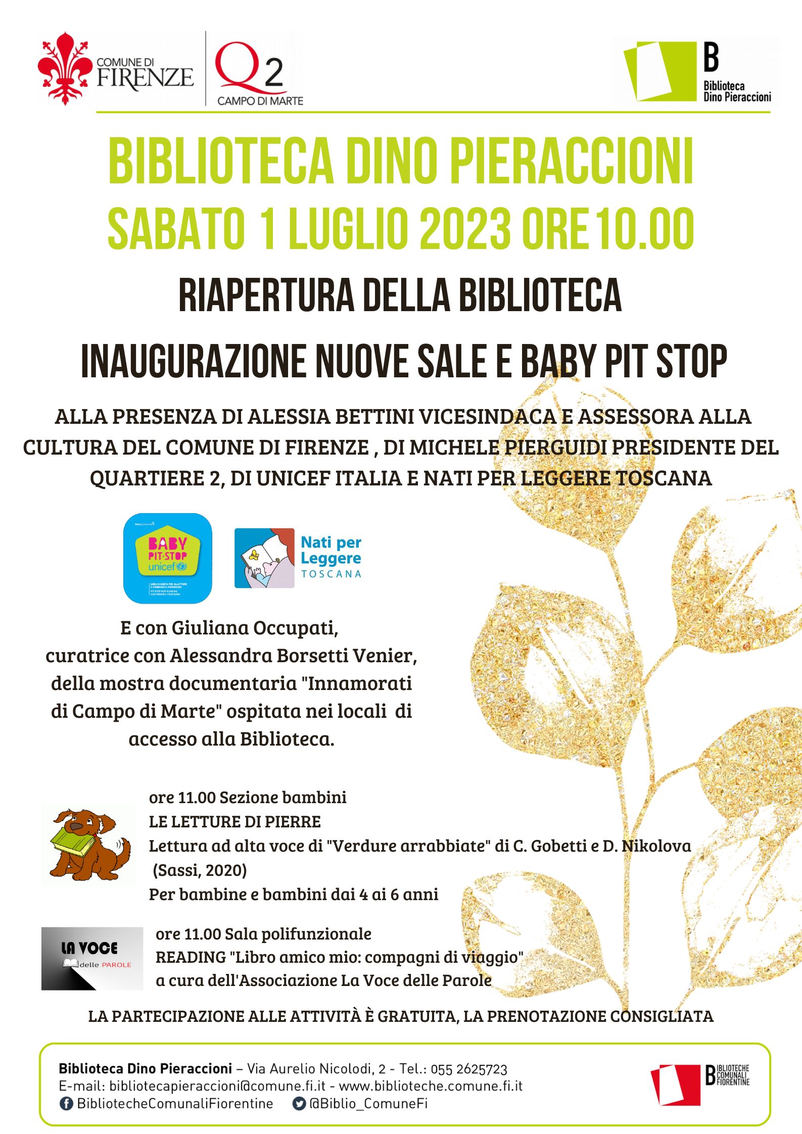 Sabato 1° luglio 2023 la Biblioteca Dino Pieraccioni, chiusa al pubblico dall’aprile scorso per il riallestimento di alcune sale (gli ultimi lavori hanno interessato in particolare le prime tre sale ed il corridoio d’ingresso), riaprirà con una grande inaugurazione, a partire dalle ore 10.00. All’inaugurazione dei nuovi spazi saranno presenti Alessia Bettini, Vicesindaca e Assessora alla Cultura del Comune di Firenze, Michele Pierguidi, presidente del Quartiere 2, Unicef Italia e Nati per Leggere Toscana.