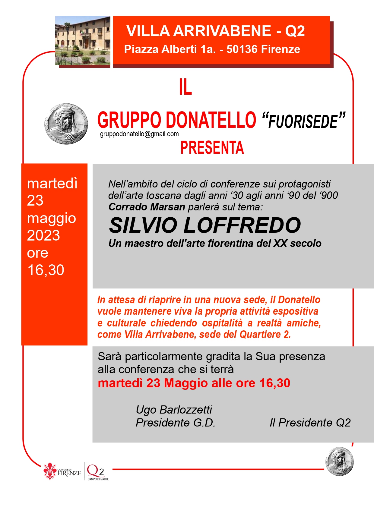 Martedì 23 Maggio 2023 alle ore 16.30, nella sala Libero Beghi in Villa Arrivabene, si terrà il nuovo appuntamento del ciclo di conferenze a cura del Gruppo Donatello, incentrata sulla figura del pittore fiorentino del '900 Silvio Loffredo.