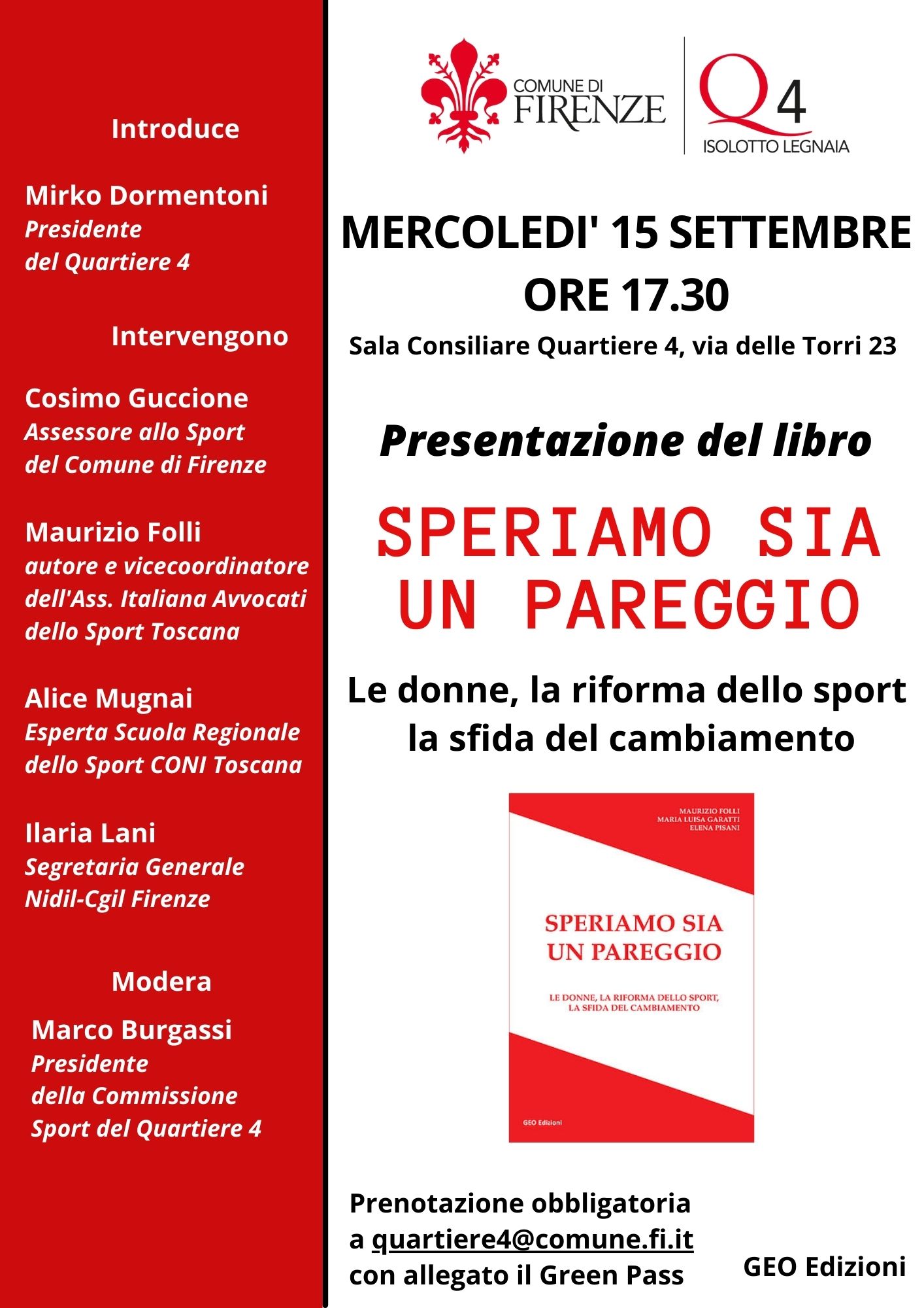 Prenotazione obbligatoria a quartiere4@comune.fi.it con allegato il Green Pass