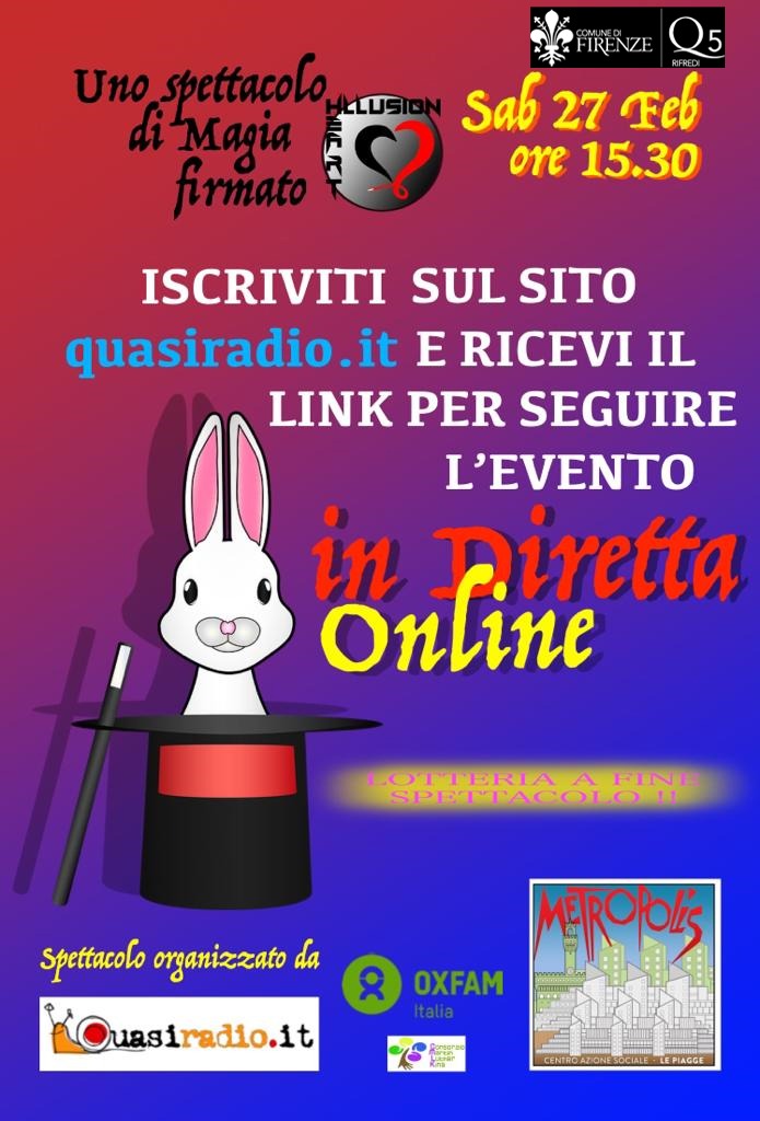 Il Centro Metropolis, l’Associazione Ieri Oggi e Domani e Oxfam Italia da anni attivi nel territorio delle Piagge presentano, in collaborazione con il Quartiere 5, uno spettacolo di magia on line per bambini e ragazzi.