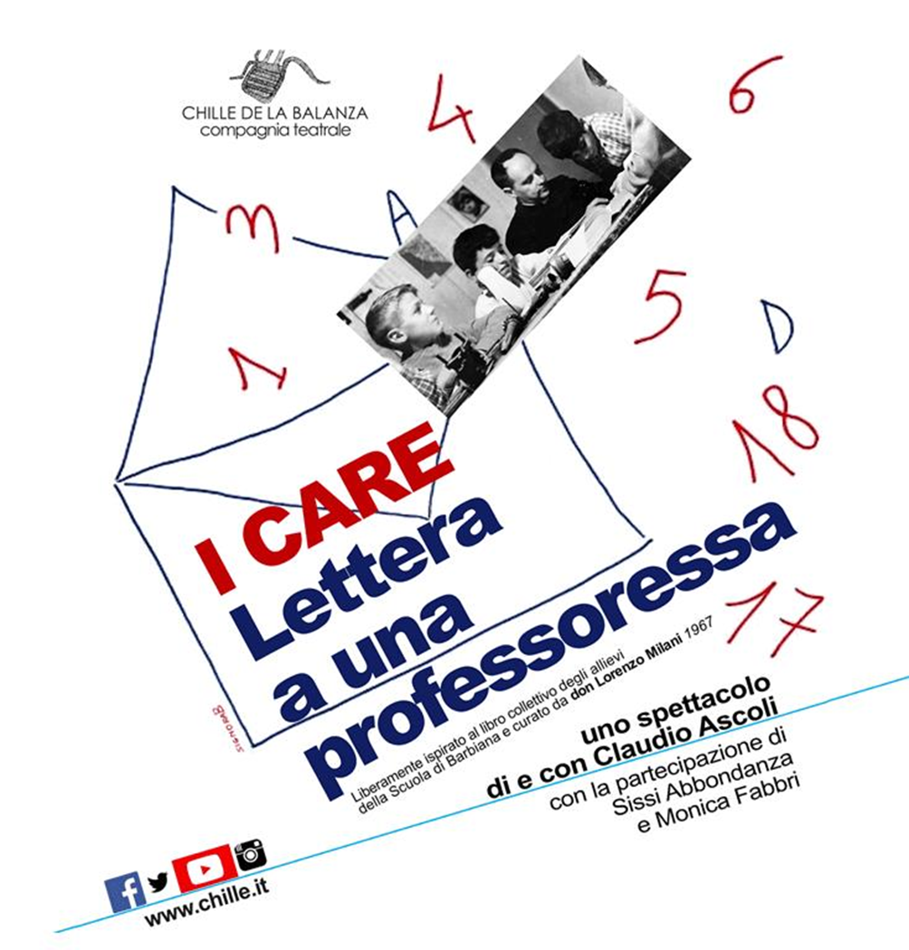 Domenica 28 Maggio alle ore 21.30, presso la sede della compagnia teatrale "Chille de la Balanza" (a San Salvi città aperta - Via di San Salvi n.12 padiglione 16), si terrà lo spettacolo "I CARE. Lettera a una professoressa"; uno spettacolo che è anche anteprima del Festival "I CARE. DON MILANI 100", progetto speciale dell'Estate Fiorentina 2023, che si svolgerà dal 2 giugno al 15 agosto in occasione del centenario dalla nascita di Don Milani.