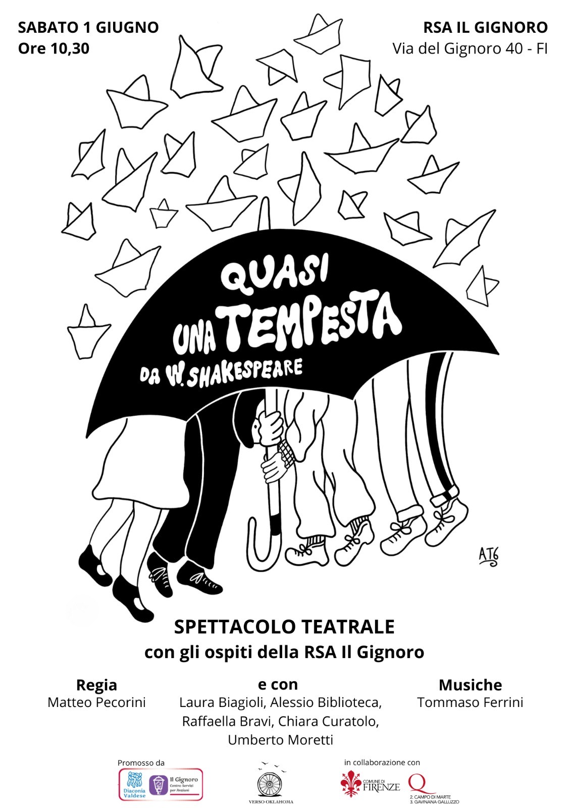 Sabato 1 giugno 2024 alle ore 10.30 presso la RSA Il Gignoro (Via del Gignoro, 40) si terrà lo spettacolo "Quasi una Tempesta": frutto di un laboratorio di teatro e musica, lo spettacolo vede più di 20 interpreti tra ospiti, operatrici e tirocinanti. In questa speciale riscrittura della "Tempesta" di Shakespeare sono contenuti i sogni e le fantasie dei partecipanti al laboratorio: sono loro stessi i soggetti che, come nella "Tempesta", si trovano ad abitare un’isola sperduta, dopo essere scampati ad un naufragio. Ospiti, operatrici e attori, tutti quanti sono stati coinvolti in un processo di interpretazione e rigenerazione del testo, che ha portato a una riscrittura moderna e personalissima in cui la distinzione personaggio-interprete viene continuamente messa in crisi e dove i naufraghi sono le ombre del nostro presente, in balia di onde, spinte al viaggio, moti rivoluzionari, voglie di libertà e isole accoglienti, pronte a ricevere i prossimi naufraghi.