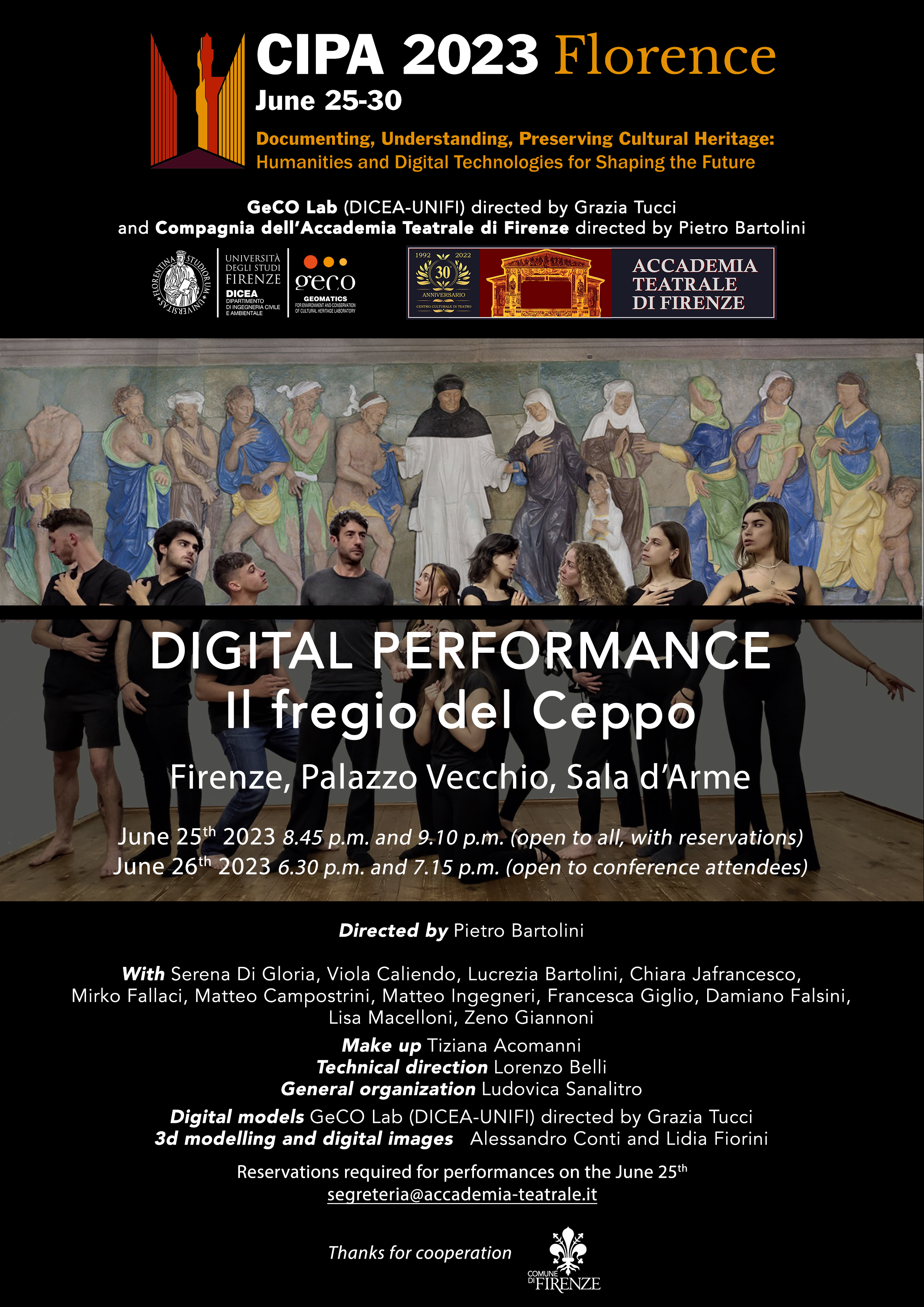 Domenica 25 Giugno alle ore 20.45, nella Sala d'Arme in Palazzo Vecchio, si terrà lo spettacolo teatrale "Il fregio del ceppo", a cura dell'Accademia Teatrale di Firenze con la regia di Pietro Bartolini; uno spettacolo generato, per la prima volta, dall’intelligenza artificiale realizzato in collaborazione con l’Università di Firenze, dipartimento di Ingegneria Civile e Ambientale Laboratorio GECO, diretto dalla Prof. Grazia Tucci.