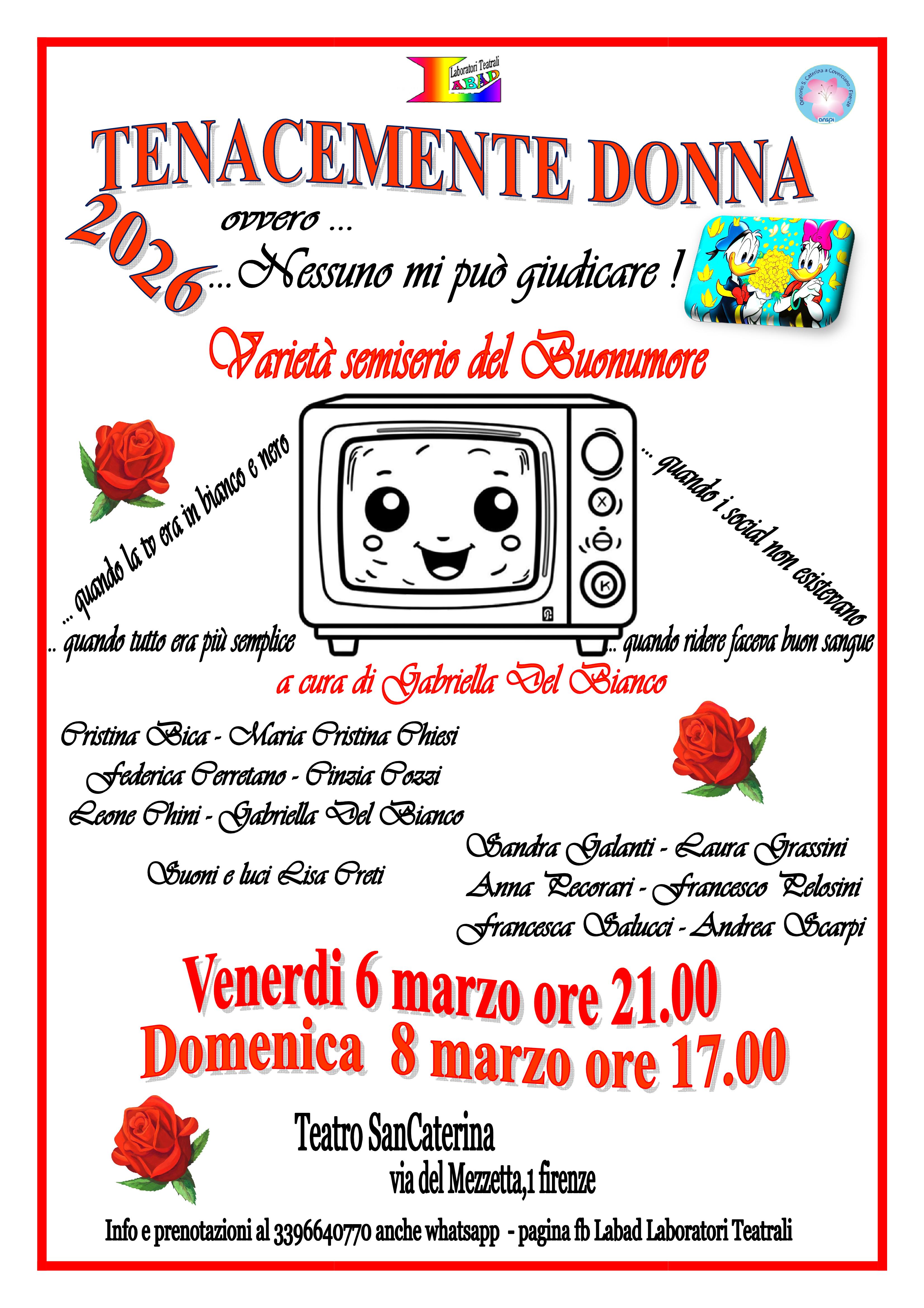 Venerdì 6 Marzo alle ore 21.00 e Domenica 8 Marzo alle ore 17.00, presso il Teatro SanCaterina in Via del Mezzetta 1, andrà in scena lo spettacolo teatrale "Tenacemente Donna... ovvero Nessuno mi può giudicare!", un varietà semiserio del buonumore a cura di Gabriella Del Bianco realizzato da Labad Laboratori Teatrali.