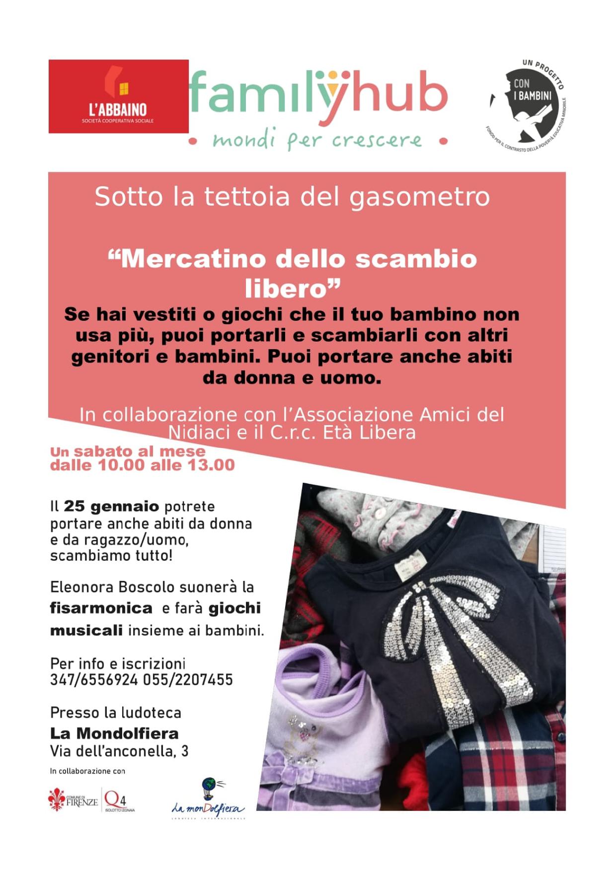 All’interno del progetto “Family Hub: Mondi per crescere” l’Associazione Amici del Nidiaci, insieme alle educatrici della ludoteca la Mondolfiera in via dell’Anconella e alla case manager, ha pensato di condividere uno spazio comune, la tettoia dell’ex gasometro posta di fronte alla ludoteca per realizzare l’iniziativa “Svuota la cameretta”, un mercato del baratto/scambio/riuso, sul modello di quello che ha tanto successo nelle piazze cittadine. Il mercatino diventa così un luogo dove le persone possono incontrarsi, conoscersi tra loro, creare scambi e legami di solidarietà, dando vita ad una comunità maggiormente coesa e solidale, per ridurre i fenomeni di atomizzazione e isolamento.