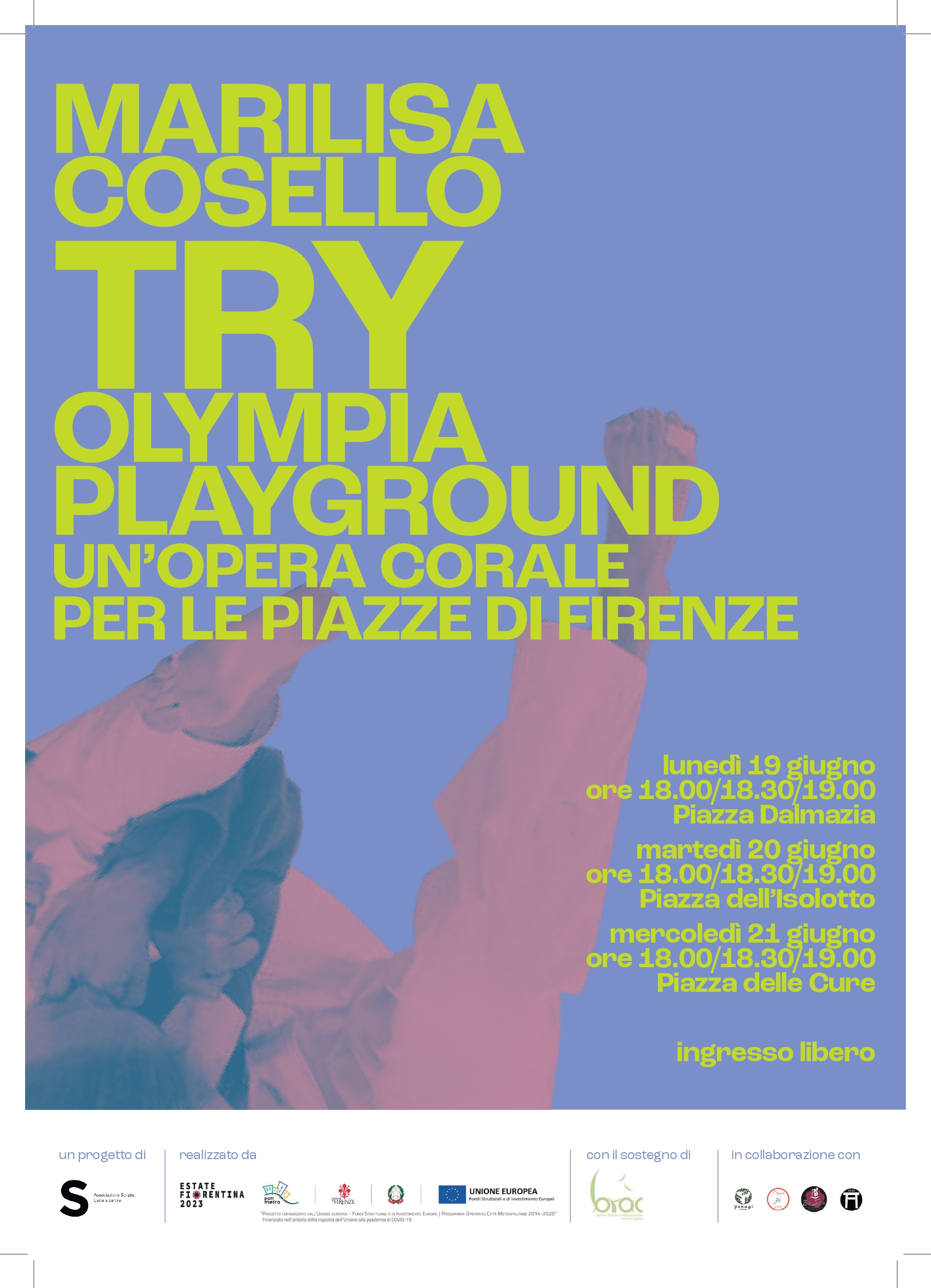Nel quadro dell’Estate Fiorentina 2023 l’associazione “Scripta. L’arte a parole” presenta (Try) Olympia Playground, un progetto dell’artista Marilisa Cosello a cura di Pietro Gaglianò che vedrà coinvolte tre piazze del territorio fiorentino nei giorni 19, 20 e 21 Giugno.