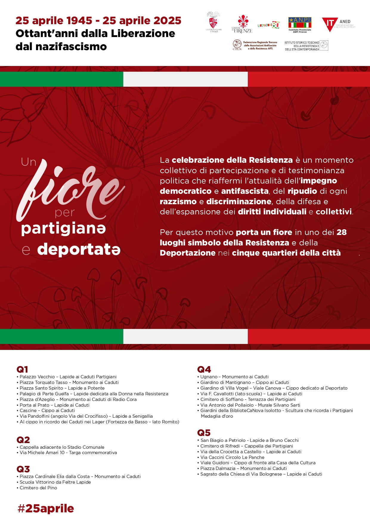 Anche nel Quartiere 2 la celebrazione della Resistenza a ottant'anni dalla Liberazione del nazifascismo, in una serie di manifestazioni nell'ambito dell'iniziativa "Un fiore per partigianə e deportatə", che individua 28 luoghi dei cinque quartieri fiorentini come simbolo della Resistenza. Ogni cittadino potrà portare un fiore, a testimonianza del momento collettivo di partecipazione che rappresenta la celebrazione del 25 aprile.