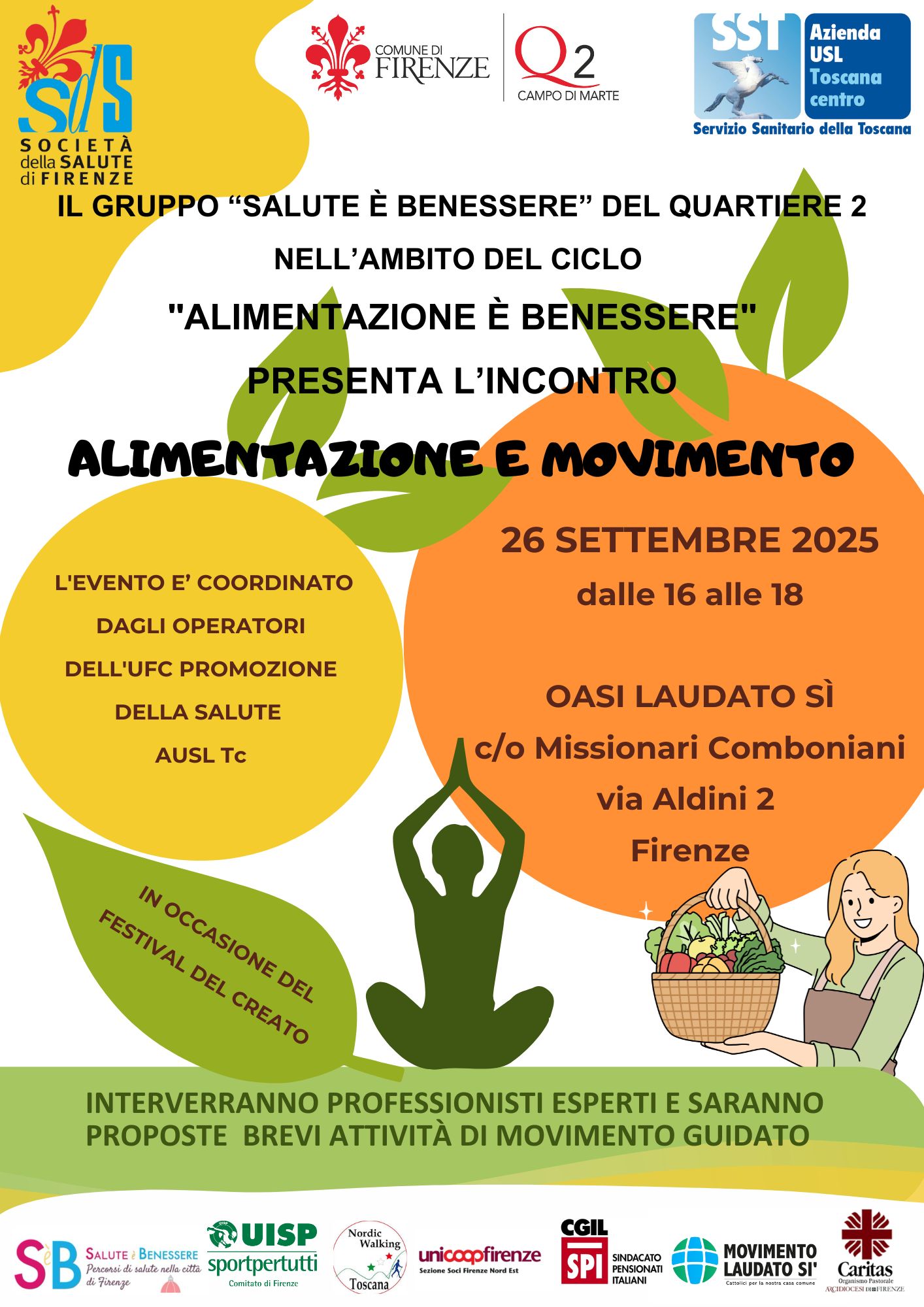 Ultimo incontro del ciclo "Alimentazione è Benessere", a cura del gruppo Salute è Benessere del Quartiere 2, dal titolo "Alimentazione e movimento", venerdì 26 Settembre dalle ore 16:00 alle ore 18:00 presso l'Oasi Laudato Sì in via Aldini n.2.